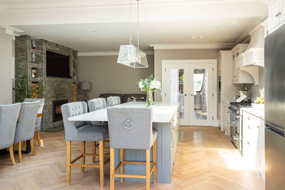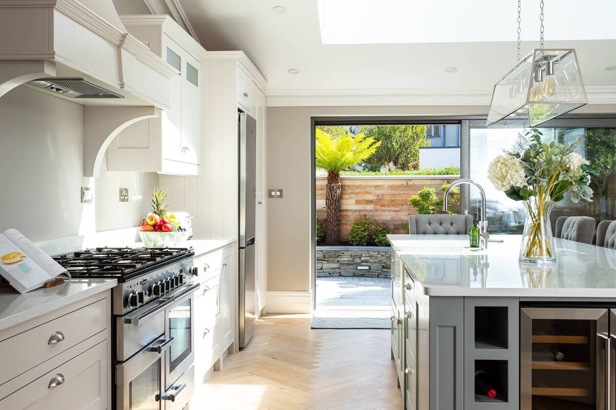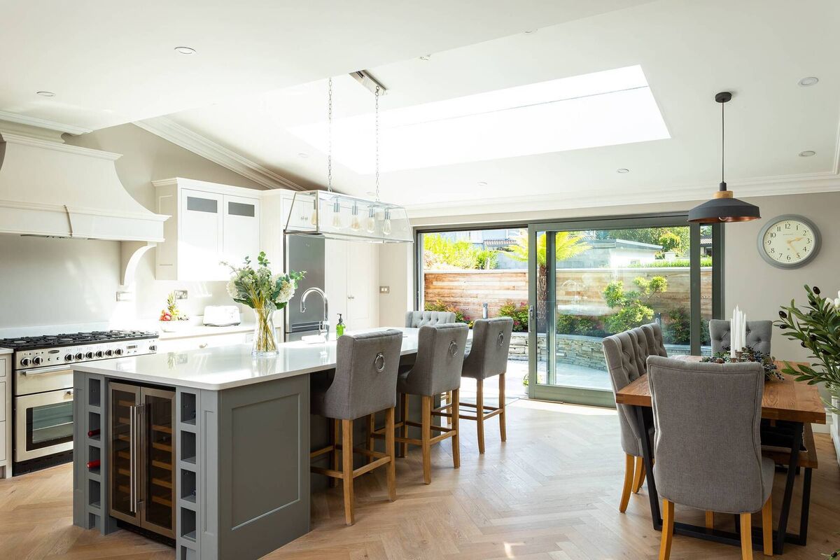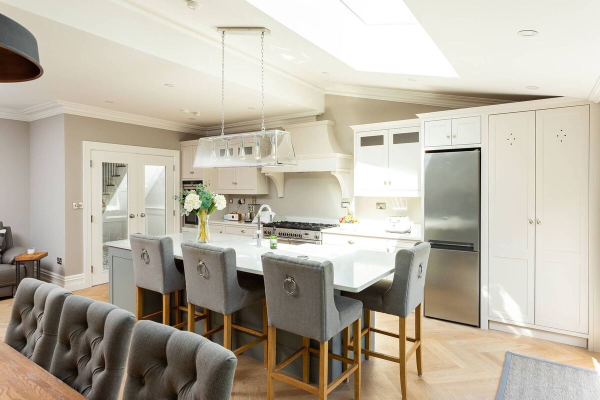 The painted kitchen is by Cash & Carry, with quartz tops, Quooker tap, Rangemaster oven and high-end appliances, plus a wine cooler, with the units built in-frame: That latter choice for units was indicative of the fact the owners planned this as a home for life and the long-term when they got ready to roll up their sleeves in 2016 and 2017.