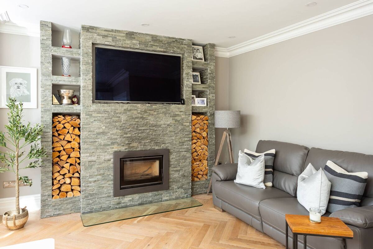 Behind, to the left off the hall and optional bedroom is a large utility, and straight through from the hall, via glazed double doors, is the now-extended kitchen/living/dining, with an integrated wood-burning stove, with timber log storage on either side in a slip-stone chimney breast.