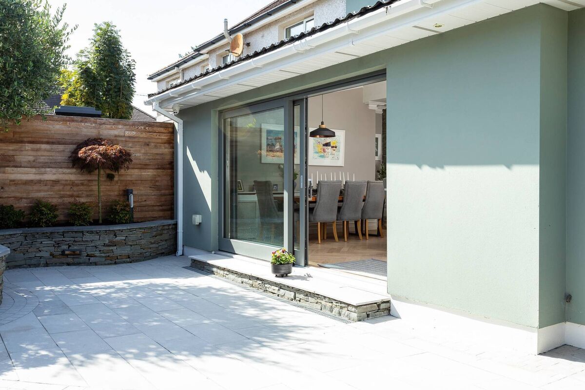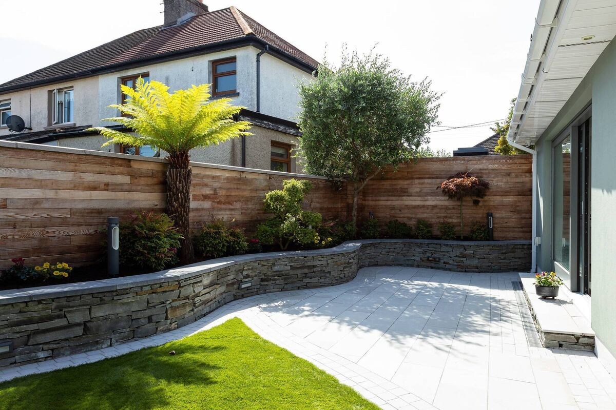 A large, sliding door connects this airy space to a rear patio/sun terrace, with Portuguese limestone base, and planting (including a tree fern) along a low Kilkenny limestone wall done “dry stone” style, and the back boundary is in cedar sheeting.