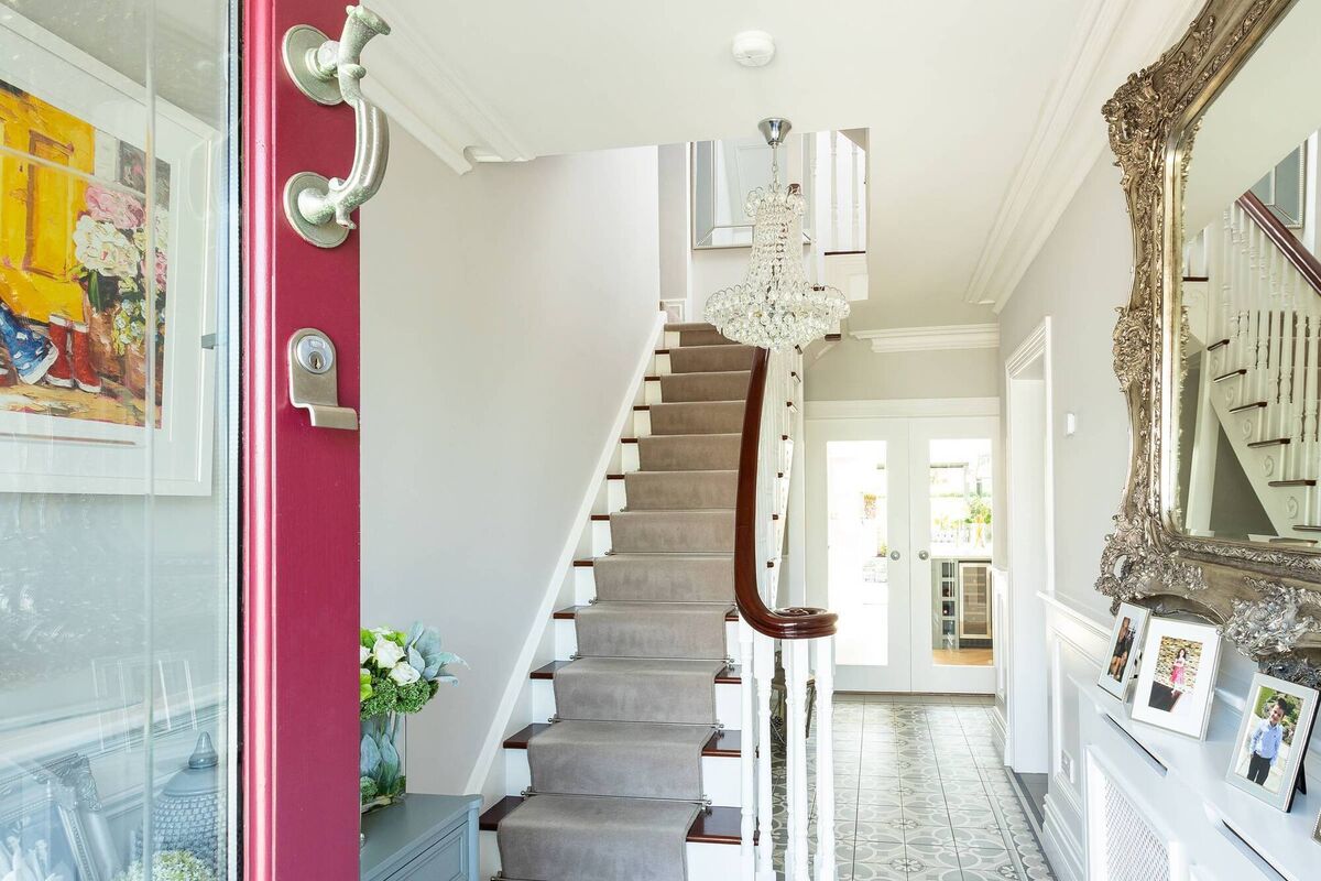 Elements of the decor range from the classical — such as that polished mahogany, deep ceiling coving, tall 9” skirtings, wall wood-paneling etc — to more contemporary and modern, such as in the services with central comms services, Thermo solar panels, remoted control access, alarm/CCTV, sanitary ware/bathrooms, etc.