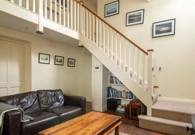 The upper floor has a bathroom with a jacuzzi bath, two bedrooms, and a small room used as an office which has a porthole window.