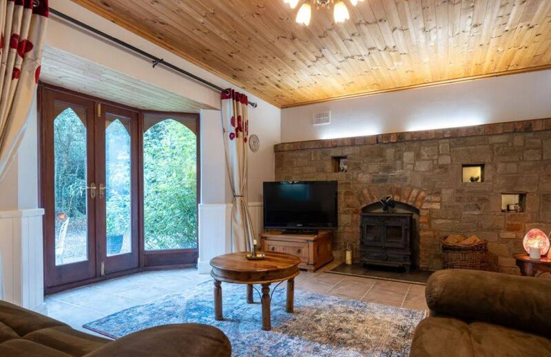 Building it on a wooded 2.3-acre site, they designed it to resemble a cut stone gate lodge giving it redbrick quoins and gothic-style arched windows and using timber panelling on the interior to create a rustic-style appearance.
