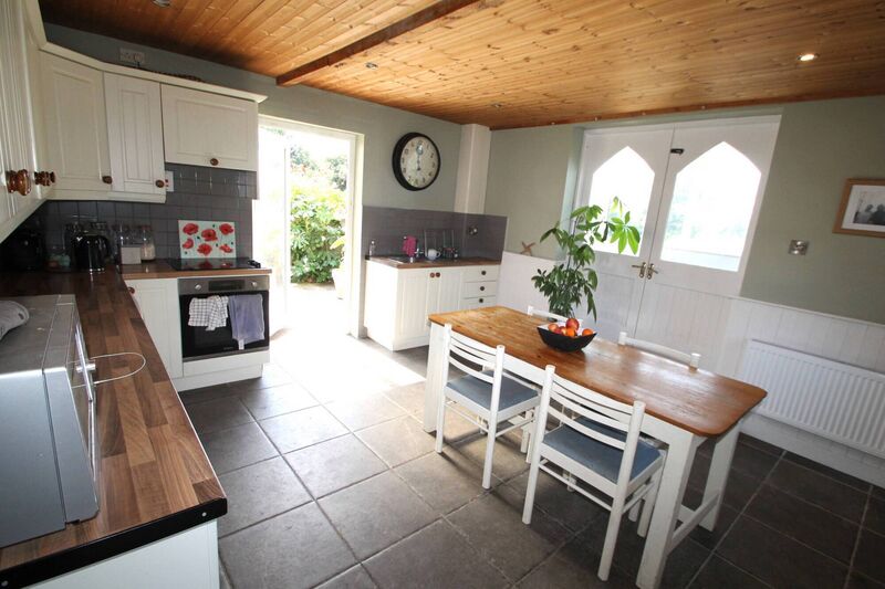 Offering 137 sq m of living space it has a sitting room with a stone fireplace and a stove as well as a country-style kitchen with cream units, marble worktops, and a solid fuel range. The property also has a utility room and guest WC.