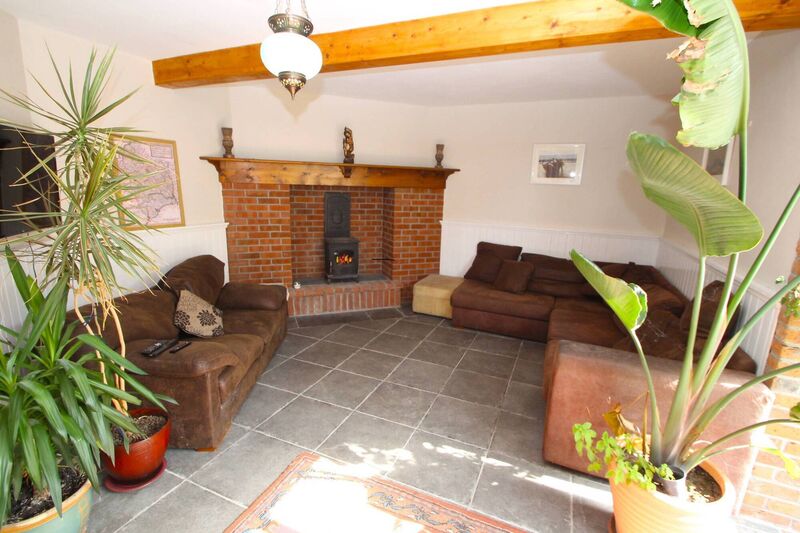 The cottage also has a front sitting room with a brick chimney breast and a stove as well as a ground-floor bathroom and bedroom. The upstairs has a bathroom and two bedrooms including a large timber-floored one with exposed timber beams.