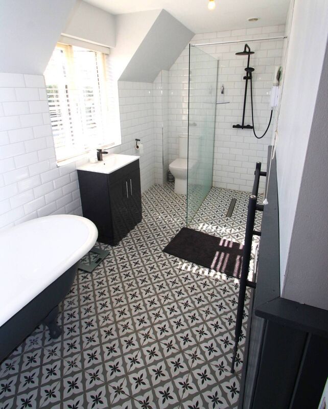 The interior of the small 1900s-built artisan cottage has been colourfully and creatively upgraded in the last five years and includes a stylish grey kitchen with white worktops, copper handles, and a black sink.