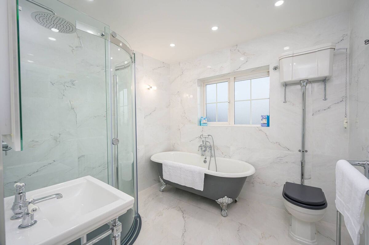 Two have en suites and one has a walk-in wardrobe. The main bathroom has both a standalone roll-top bath and a rainhead shower.