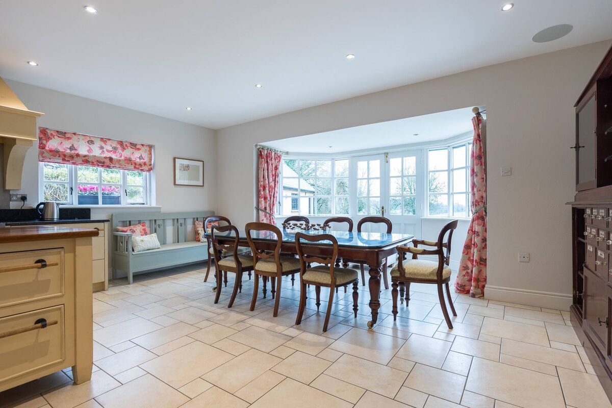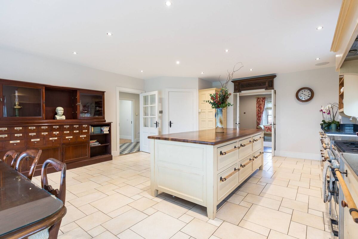 Entrance is through a tiled porch opening into a red brick-walled hallway. To the rear, there’s a very sizable kitchen/diner with country-style ochre yellow units, a large timber-topped centre island and a bay window. The extension also provides space for a utility, a guest WC and a walk-in pantry.