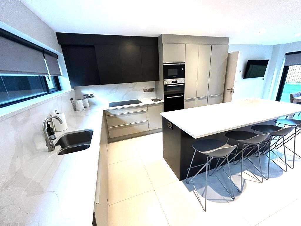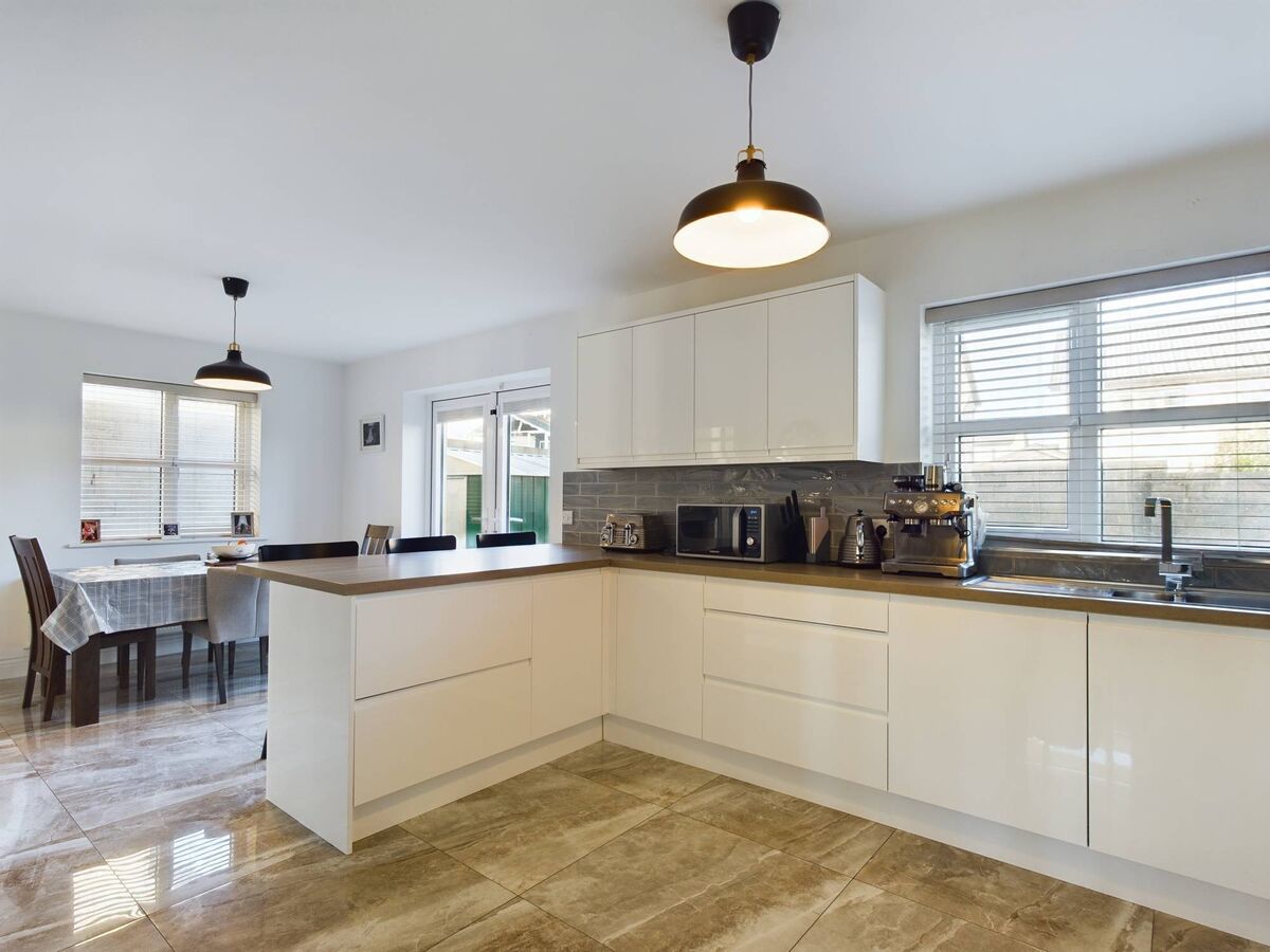 There’s 137 sq m of living space which at ground level includes a living room with a stove, a guest WC, a utility room and a study used as a gym. Double doors in the sitting room open into a spacious tiled kitchen/diner with handleless cream gloss units with a breakfast counter.