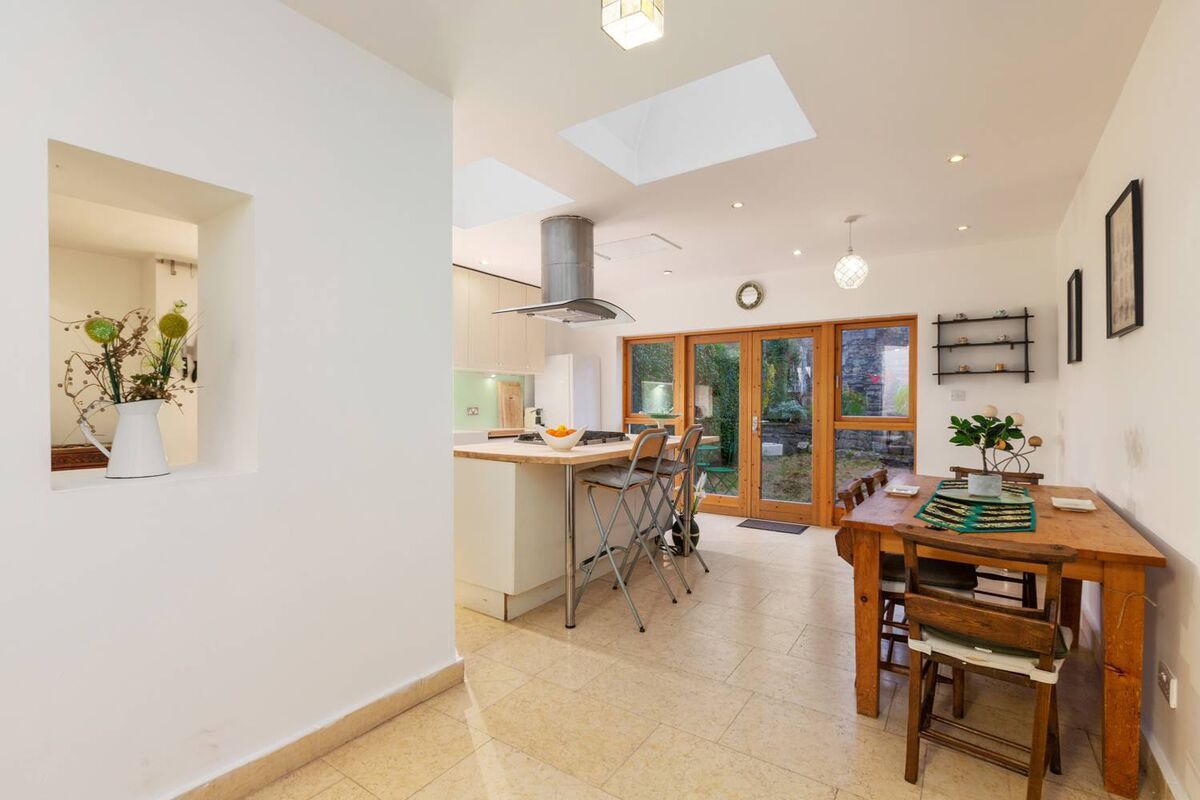 An archway on one side of the high ceilinged sitting /dining room opens into a kitchen with cream units. There’s also a sunroom/porch, two ground floor bedrooms ( one used as an office) , a utility room and in the studio, a living room and a kitchen with grey units.
