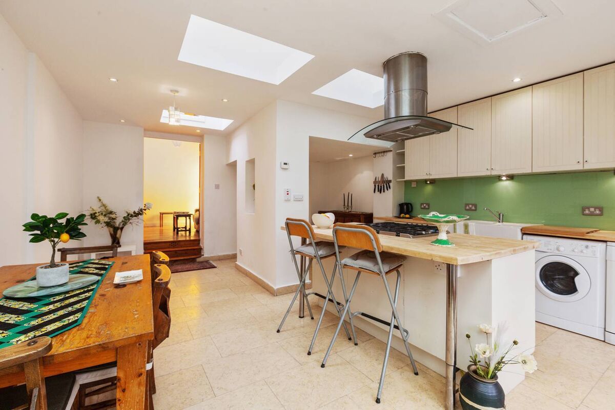 At the rear, there’s a long kitchen extension with cream-fitted units, with timber worktops, an island unit, a Belfast sink and two rooflights in the ceiling. The first-floor return has a bathroom while the upstairs has two timber-floored bedrooms. The redbrick property has kept quite a few original features including fireplaces and flooring but now has gas-fired central heating a C2 BER.