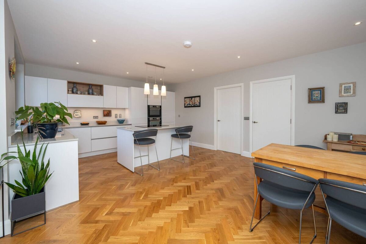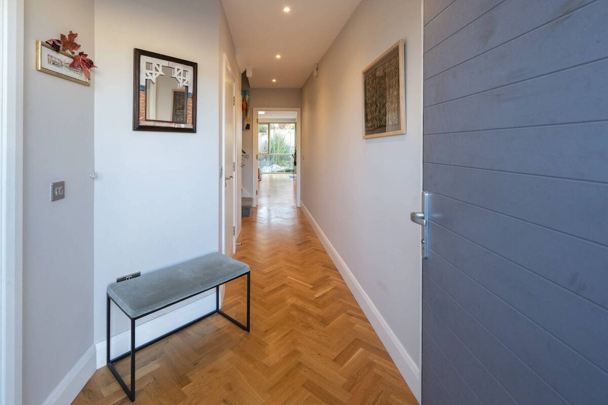 Those standards included laying a 2.2cm-thicksolid oak herringbone floor throughout ground level (including the front living room), with not a door saddle in sight to break up the flow.