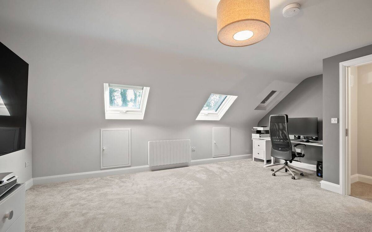 For this reason, they provided a healthy dose of sockets, saving new owners the bother, if they too decide on a top floor movie venue. Of course it doesn’t need to be for exclusive movie use. On a practical level, it’s a ready-made 38 sq m home office, with an alcove that’s just the right size to accommodate a desk/chair. The owners also had the foresight to add an extra velux over the alcove to create a bright work place.