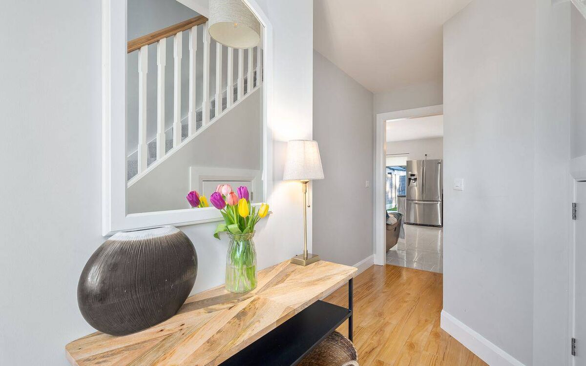 From here, a sliding glass door leads to a maintenance free garden, where there’s a compact patio of porcelain tiles, added just last year.
