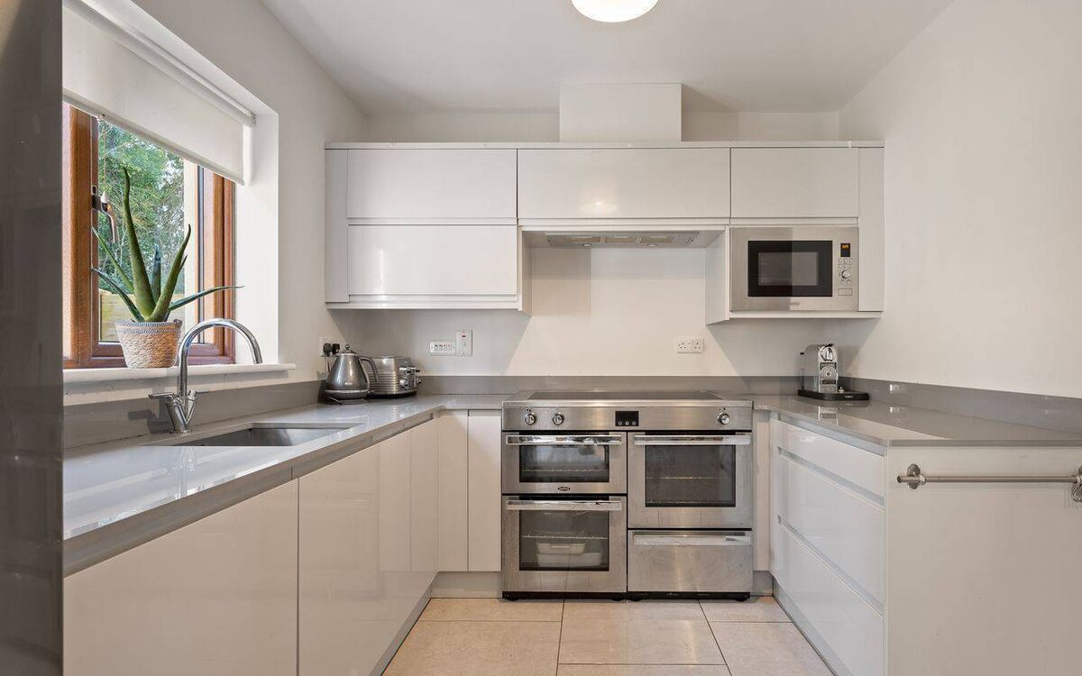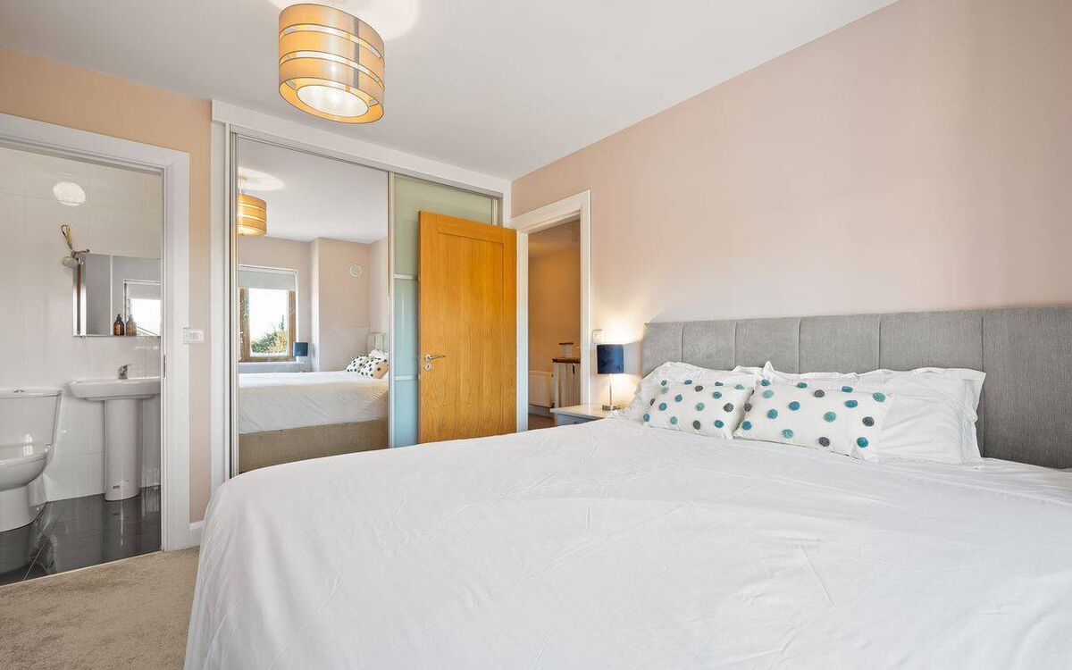 Back inside there’s a utility off the kitchen and a guest WC off the hallway. Overhead, the main bedroom of three has an ensuite.
