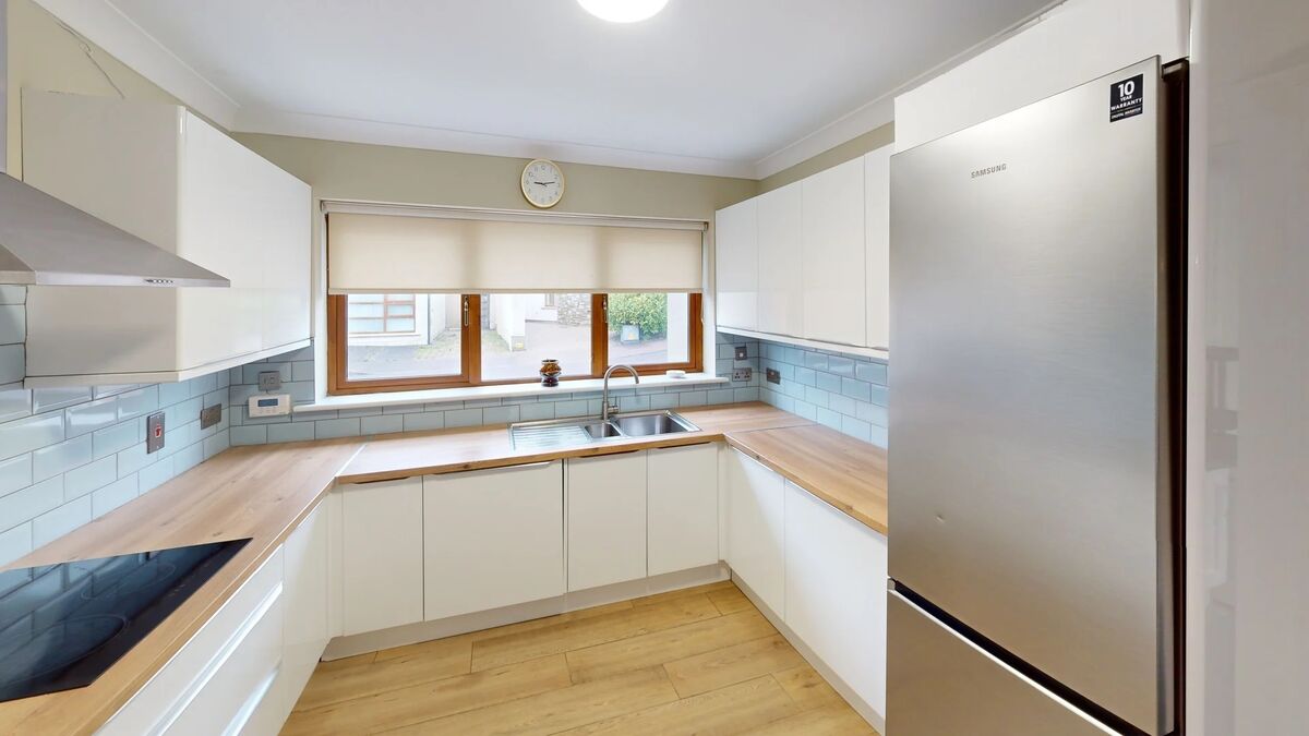 Including an integral 22 sq m garage used for utilities, the property has 166 sq m of accommodation. At ground level, there’s a spacious open-plan kitchen/dining/living space which has cream gloss units put in by the current owner.
