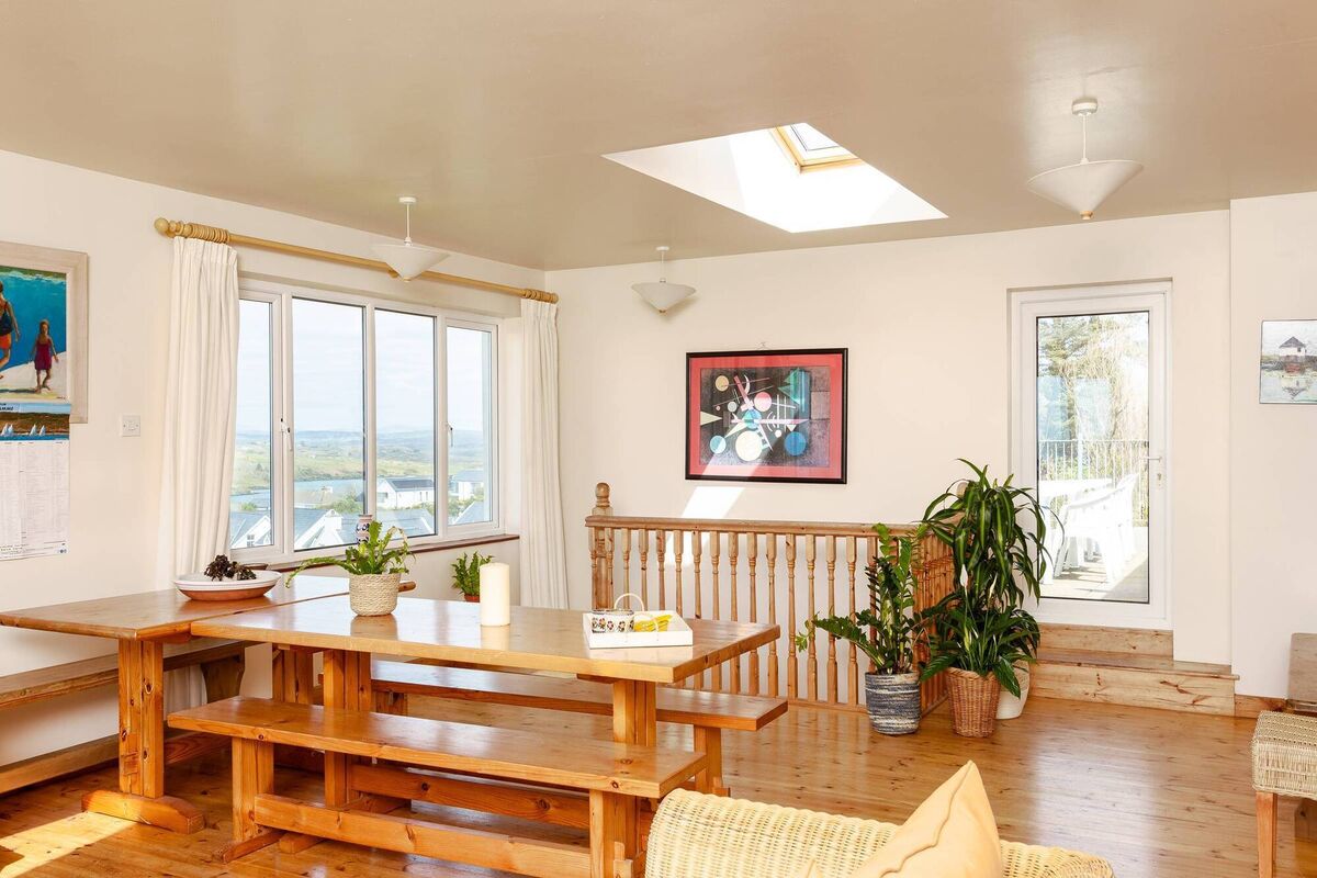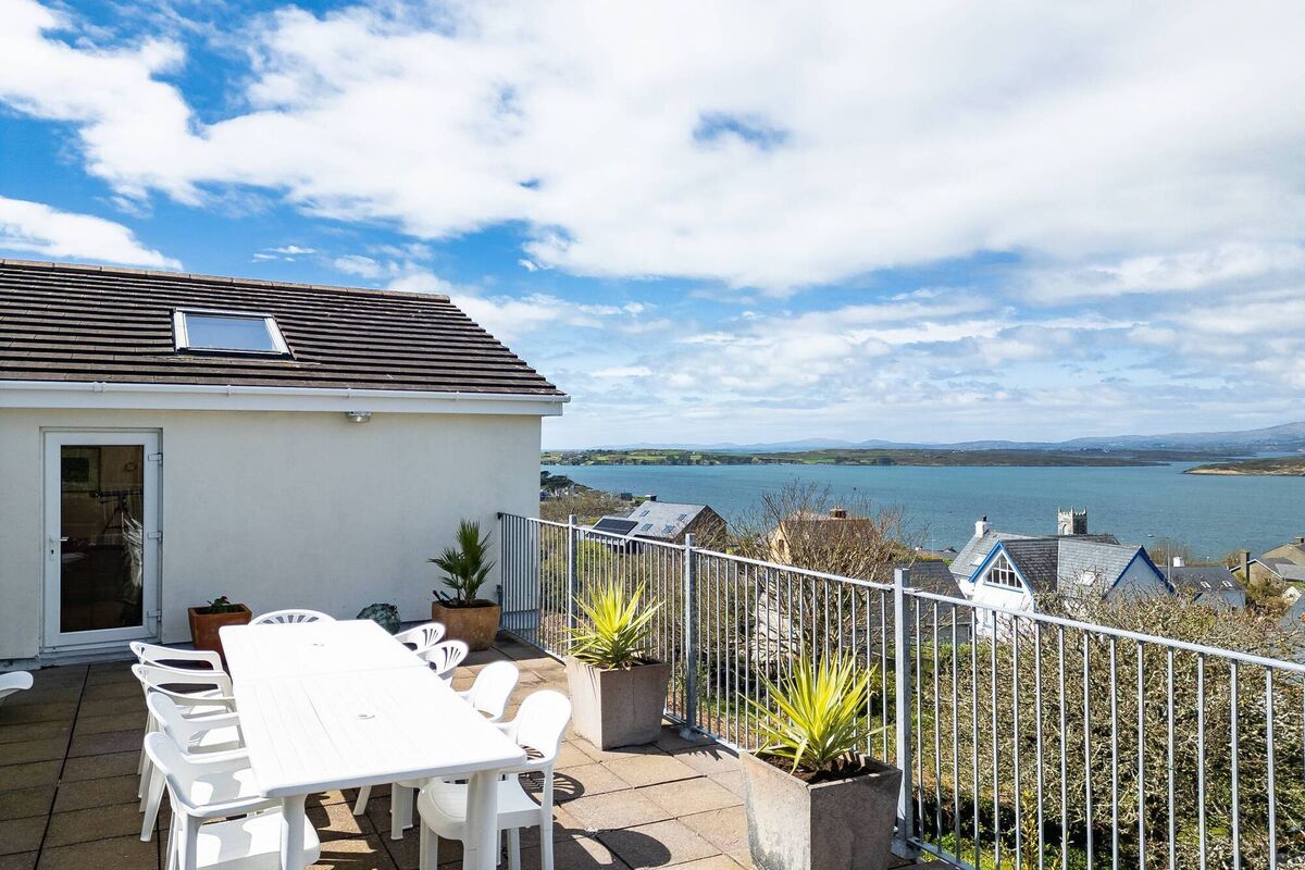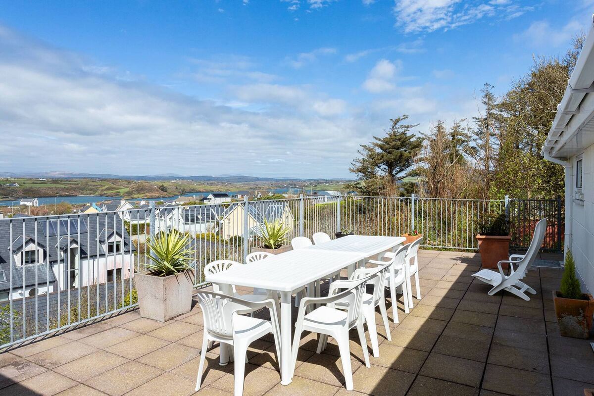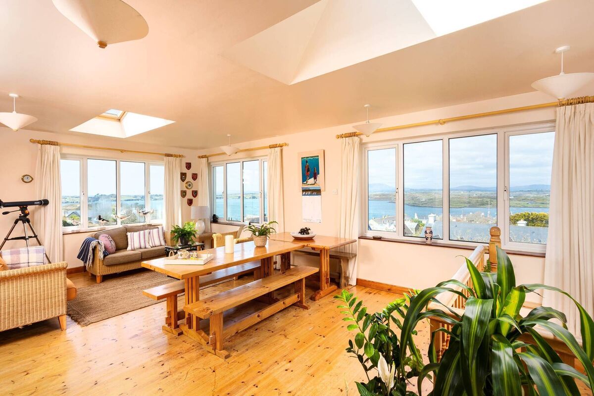The panorama from the deck is magnificent, extending to Mount Gabriel in the distance. The same view is available to whoever gets the main bedroom, which has sliding door access to the deck. The largest room, and the best indoor spot to enjoy the views, is the large living/dining room, which also has access to the 43 sq m sun deck.
