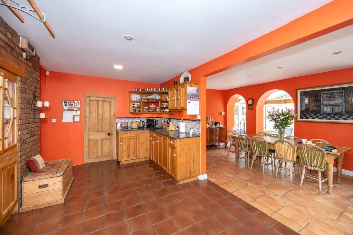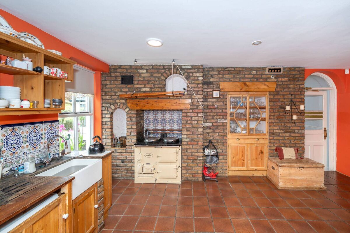 A chap with a grá for reclaimed pine fitted a new kitchen and another craftsman built a feature brick wall new into which sits the Aga and a custom-built cabinet for drinking glasses.