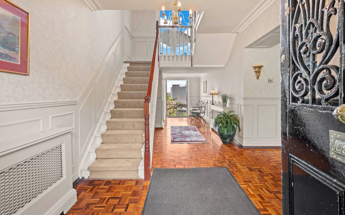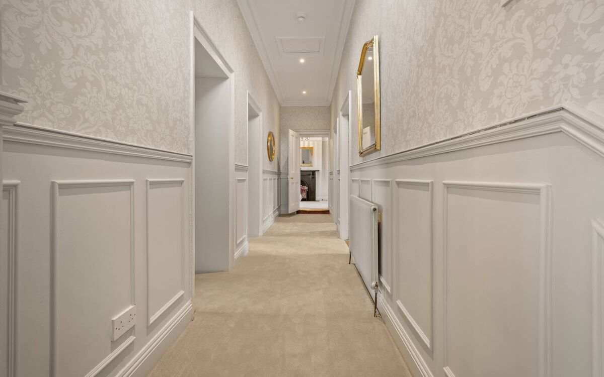 Changes that were made included replacing an open tread staircase installed in the 1960s when the house was extended to the east; the addition of panelling and coving to the hallway in keeping with the house’s heritage; the conversion of an old bathroom in the basement to a utility room; the opening up of space at the back of the main hallway by reducing the size of a large bathroom and installing a guest WC under the stairs instead; the addition of a balcony; the division of a large first floor bathroom to create an en suite for the main bedroom and the replacement of old storage heaters with gas central heating.