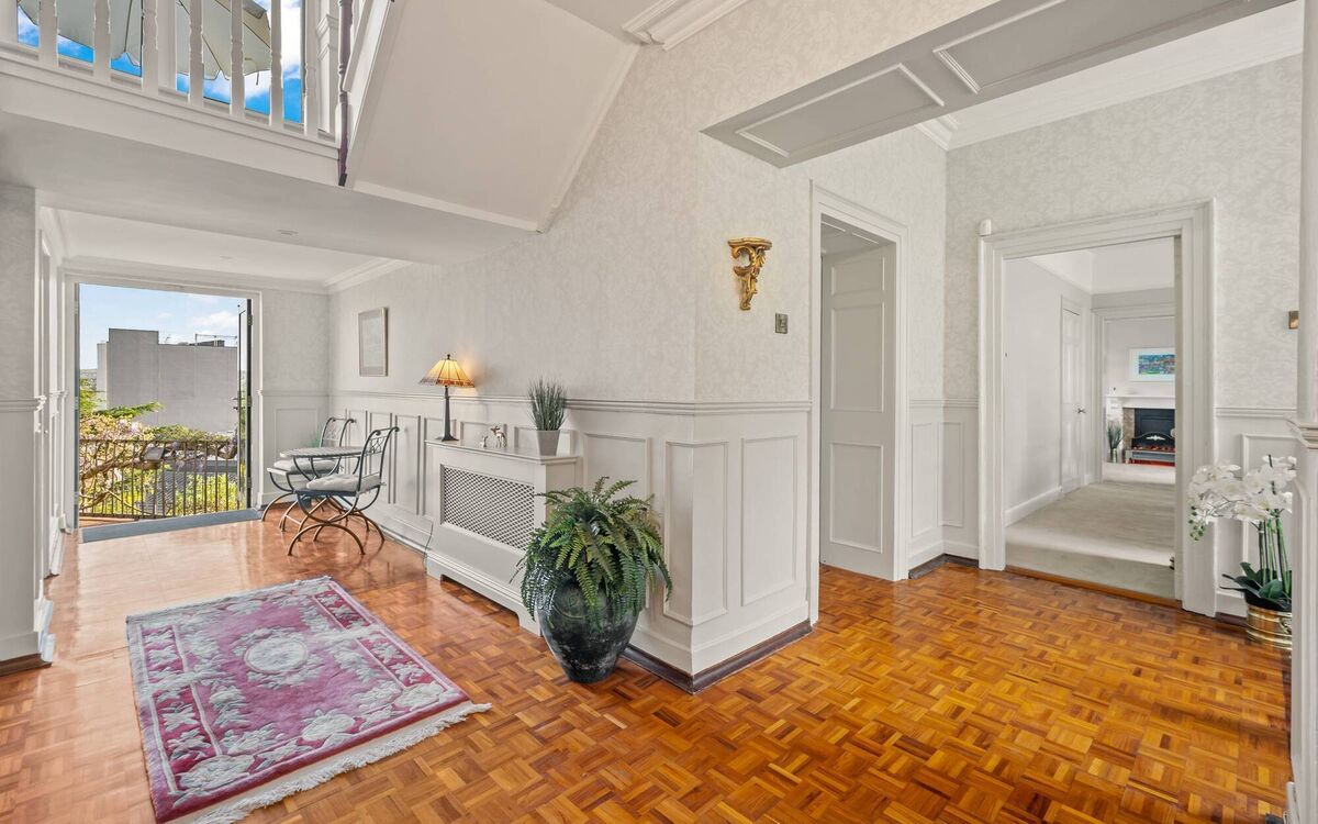 At a level above the patio, the Horgans added a terrific balcony, accessible via French doors on a half landing, with a bird’s eye view of the city, facing south, and prettied-up by a lush, forceful wisteria, that inveigled its way from the basement-level garden, up steps to the patio, and up again to the balcony, throwing off its floral notes along the way.