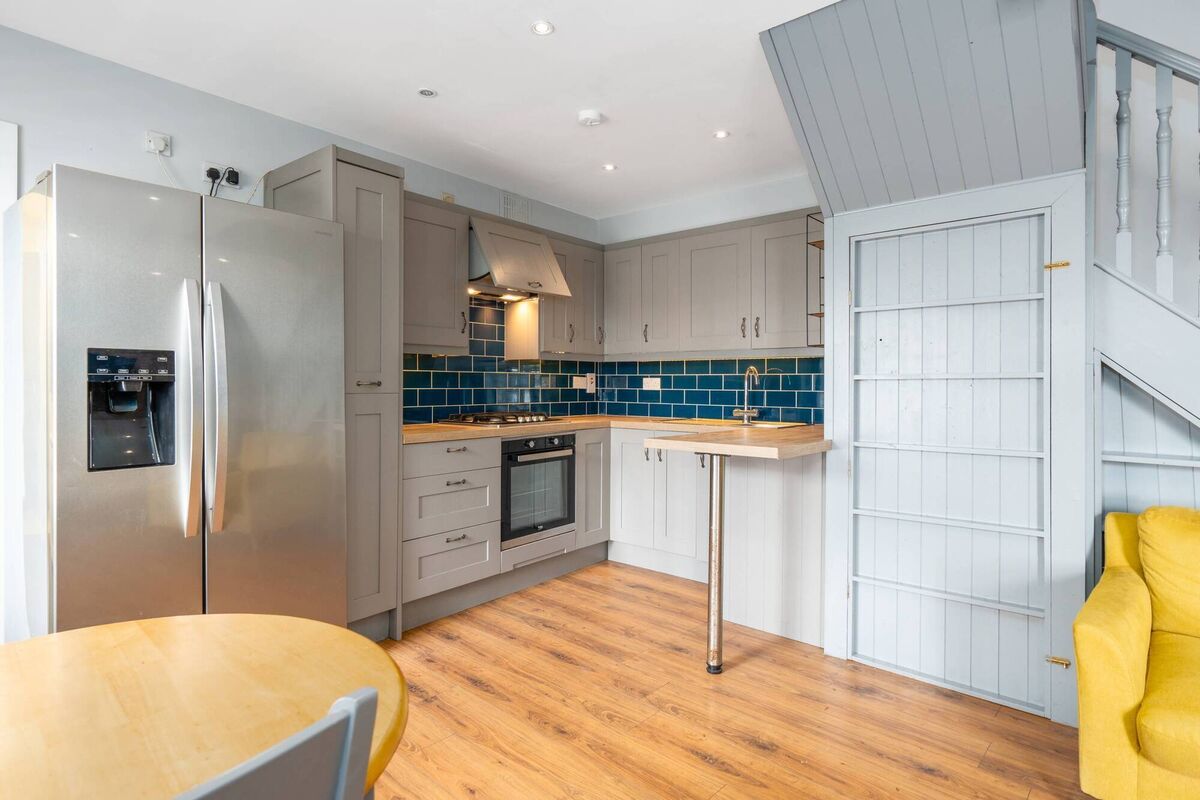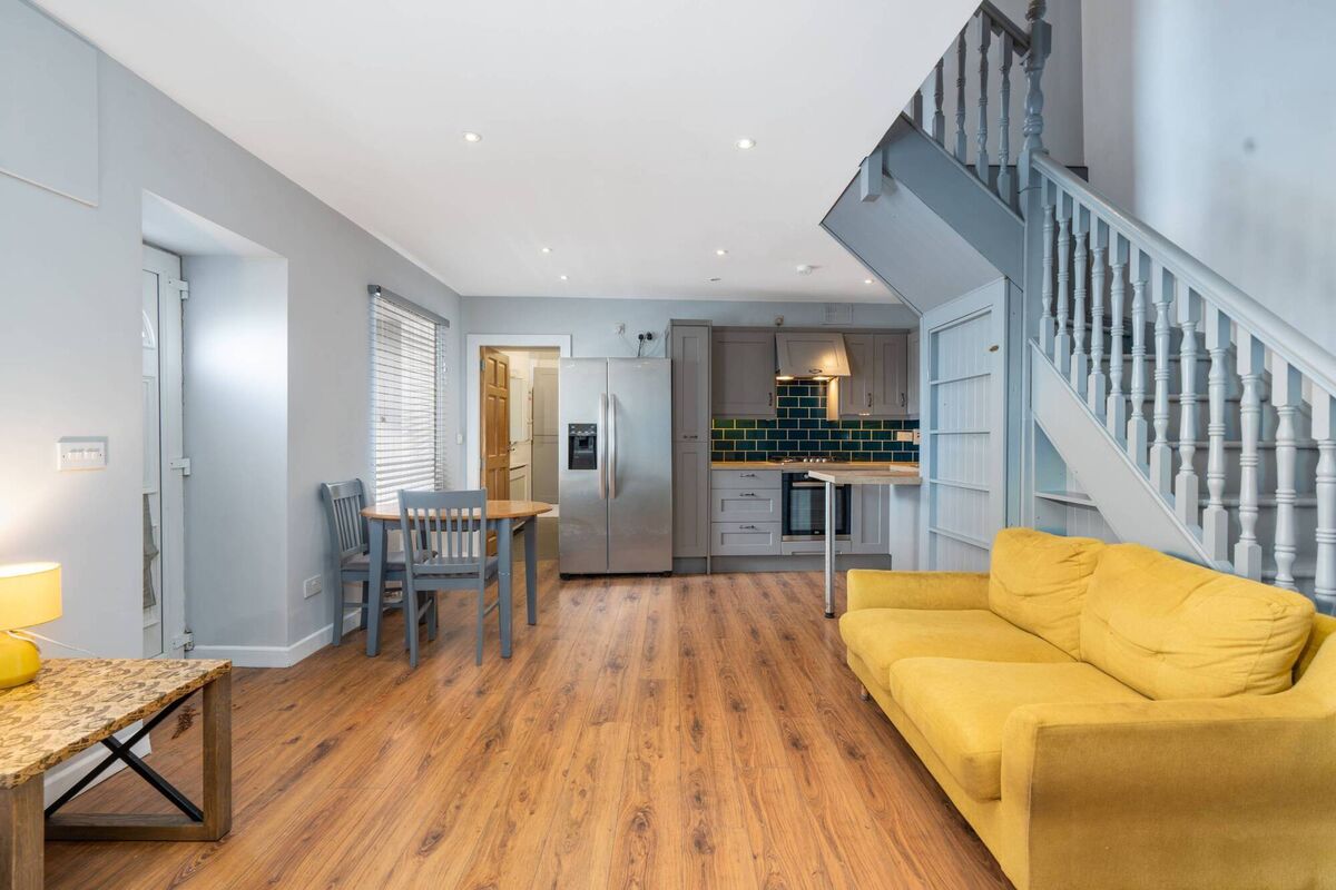 Accommodation includes open-plan kitchen/living/dining, utility, guest WC, with three bedrooms and main bathroom overhead. A small enclosed rear yard provides bin and bike storage.