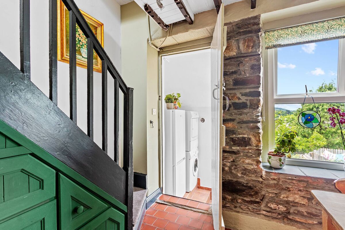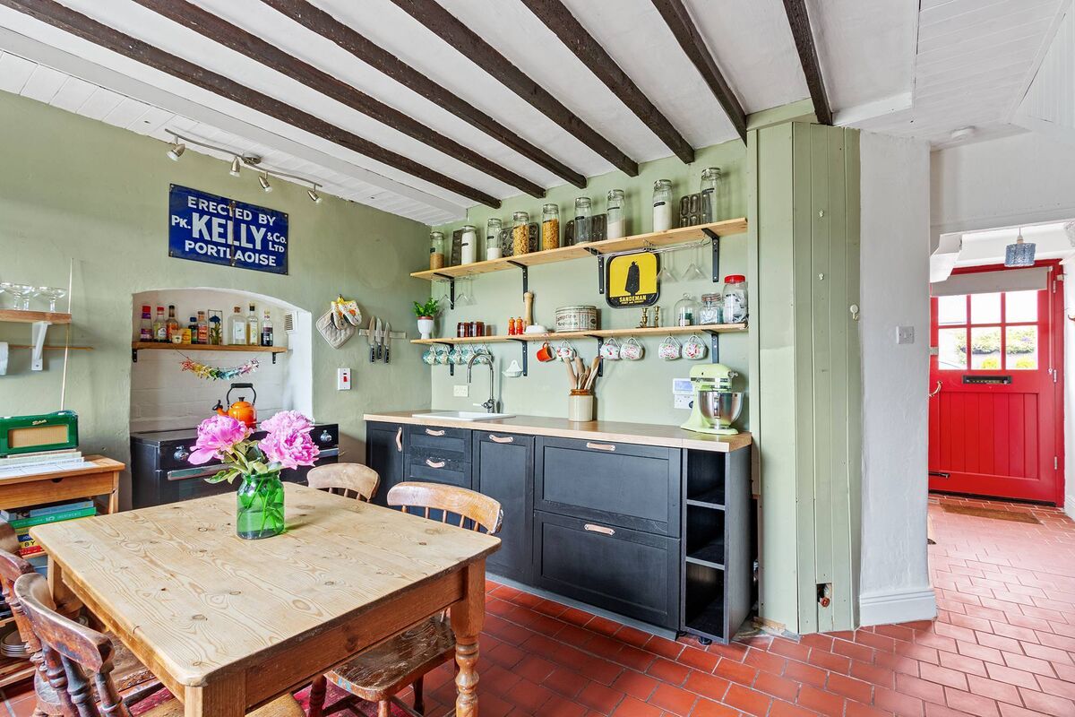 A short walk from the town centre, it has countryside views at the rear. The redecorated living room has a cast iron fireplace and one green wall, while the kitchen at the rear has grey units, exposed ceiling rafters, some exposed stonework and pale green walls. Different shades of green can be seen throughout.