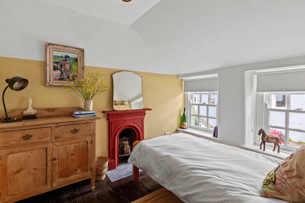 The front door is Kelly green, the understairs pull-out storage units are a darker shade while the main upstairs bedroom has olive green walls. The second bedroom has ochre yellow walls and a red cast iron fireplace but its door is green.
