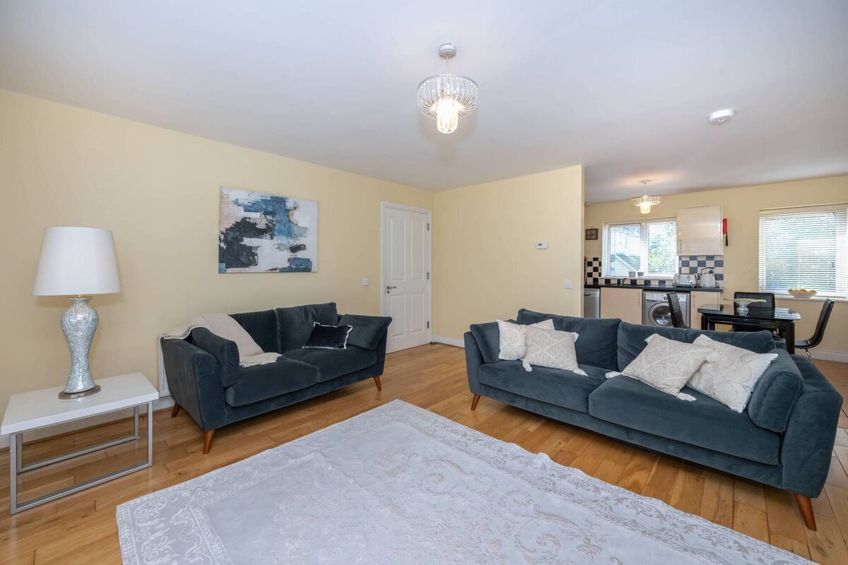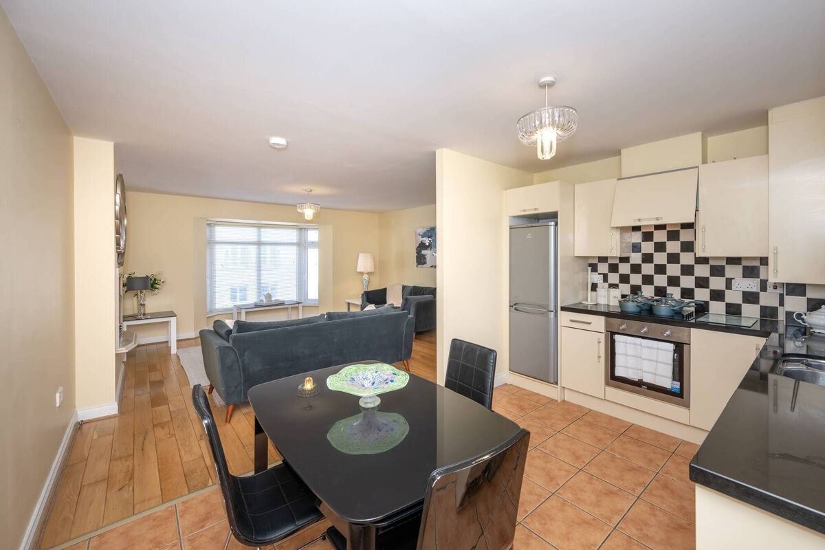 The apartment offers an open-plan kitchen/dining/living room with timber floors and cream kitchen units as well as a bathroom and two bedrooms, one en suite.
