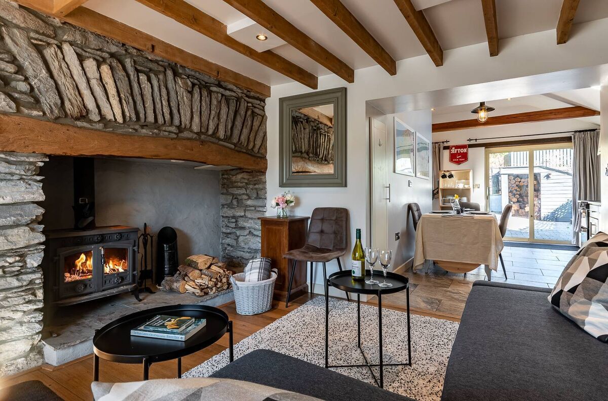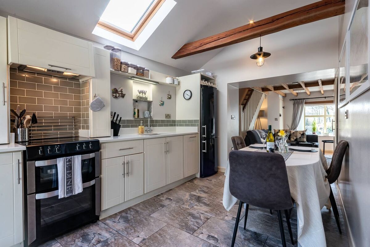 Accommodation includes a living room with a fireplace and a stove, an open plan kitchen dining room with shaker style units and a skylight as well as two bedrooms and a bathroom upstairs.