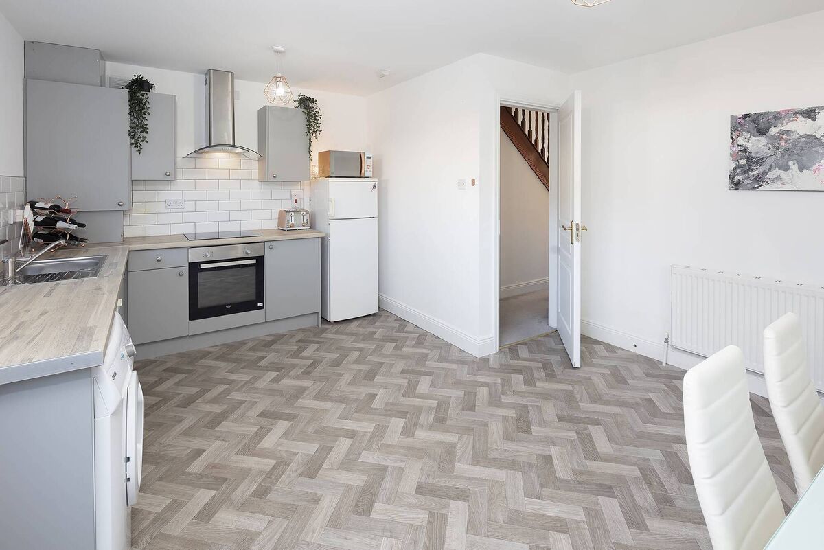 Slightly larger than the average three-bed semi, it has 113 sq metres of living space which includes a front sitting room with a fireplace and a bay window as well as an L-shaped kitchen diner with white fitted units. There’s also a separate dining room, a small utility room as well as a guest WC which is located off the hallway.