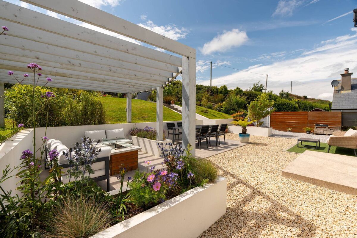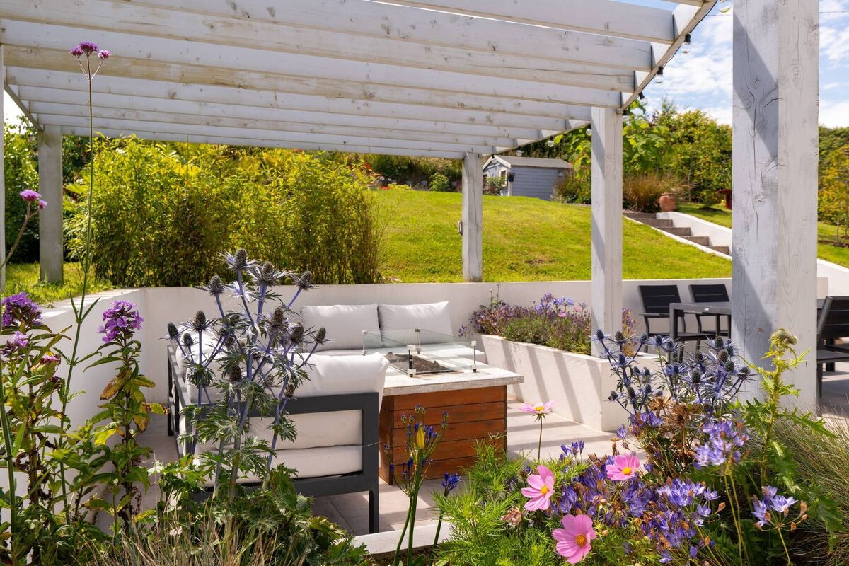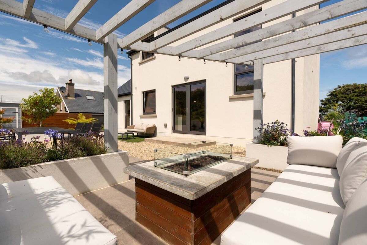 A gas fire pit is the centrepiece.