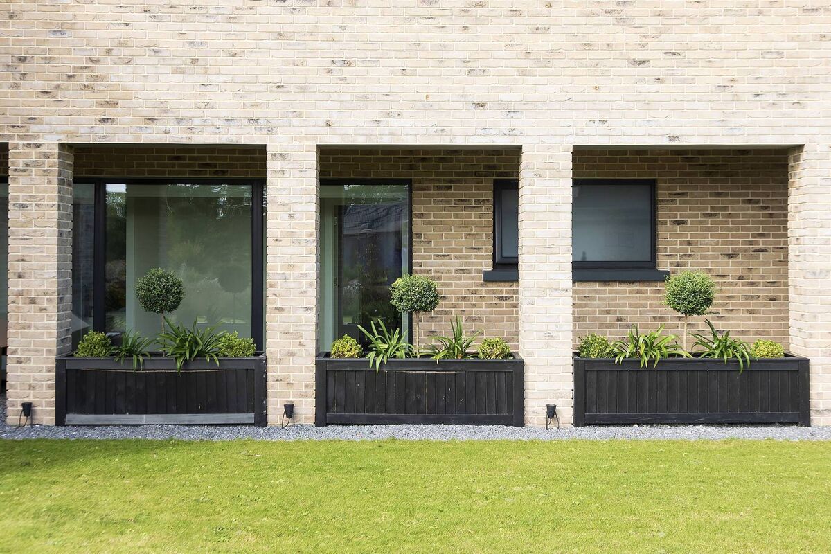 The walkway, bounded on one side by brick columns, is an eye-catching element of the house design — and there are many. Between the arches are custom-made larch plant boxes.