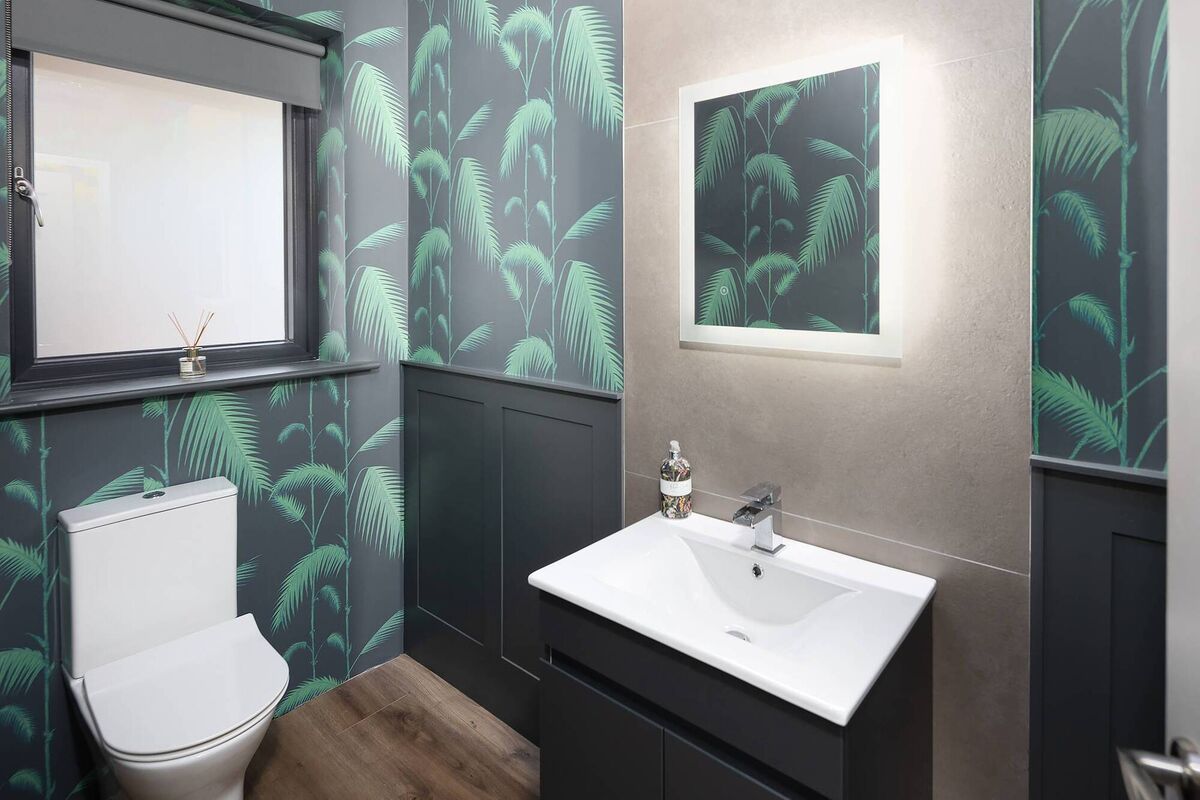 The downstairs bathrooms are quite something, overseen by an interior decorator. Art deco lighting, wainscot panelling, and exotic wallpaper are features of the guest loo.