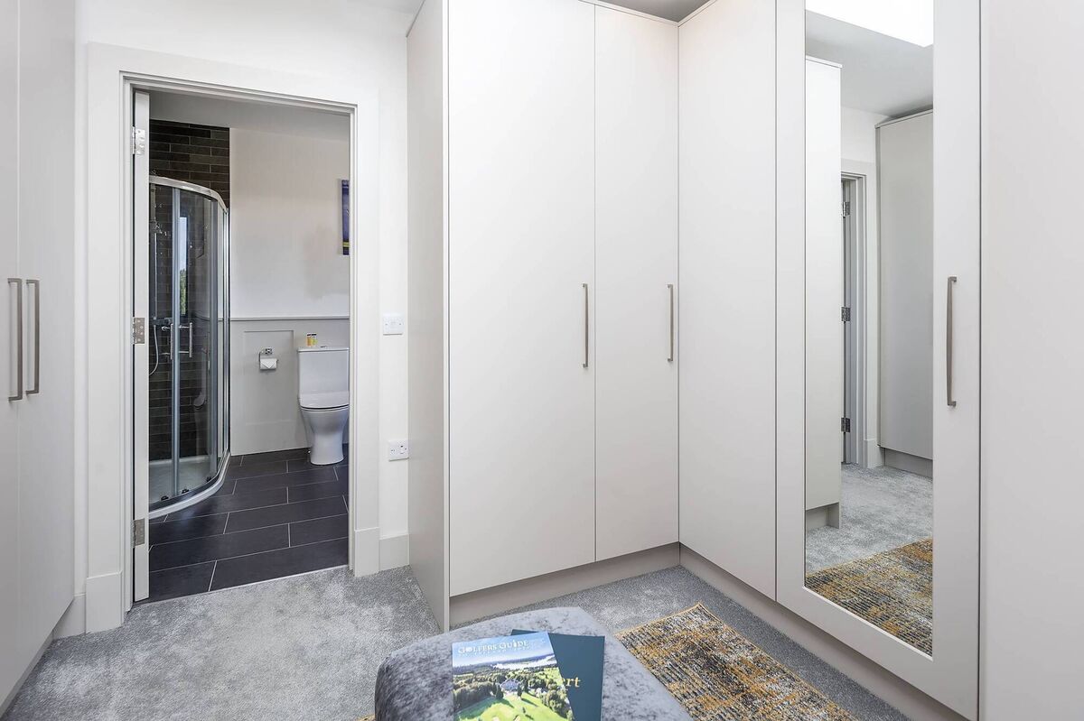 A solid oak staircase leads to the upper floor where there are two more en suite bedrooms, including the main bedroom, which comes with a walk-in dressing room.