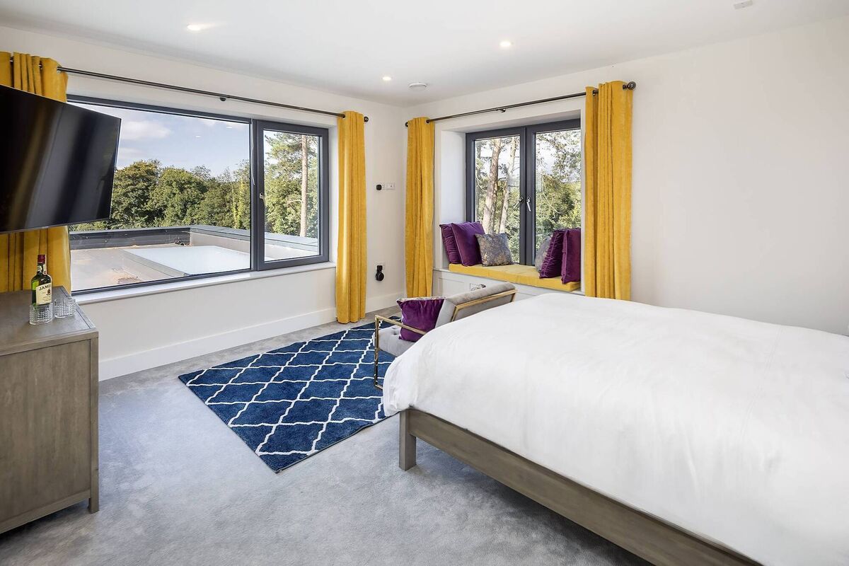 A dual aspect room with surround sound and feature panelled wall, it overlooks both river and countryside. A window seat has a cushion tailored to accommodate the windows when they’re open. Out on the landing, a second window seat runs under a wide window where light floods in. The heat recovery system is housed in a storage room off the landing. The plant room is upstairs too.