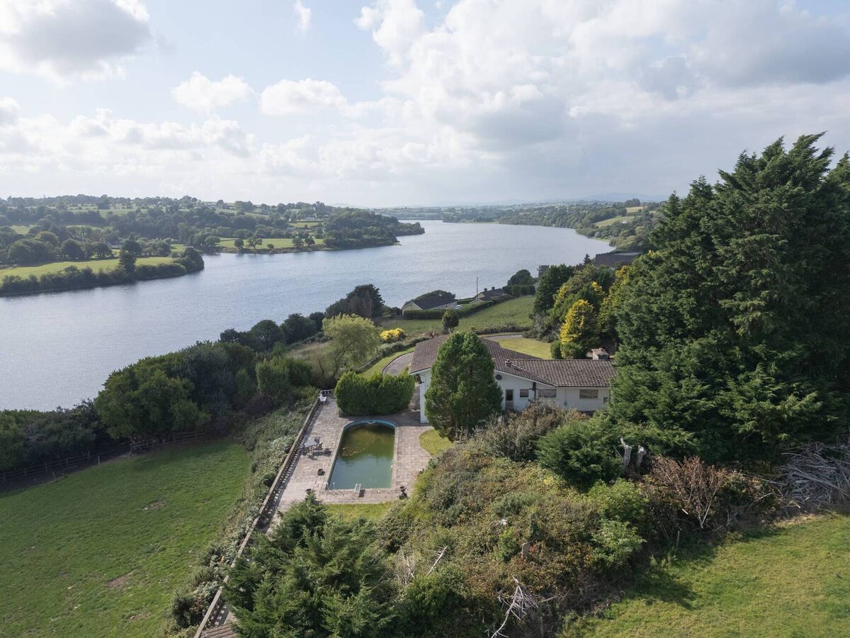 Look west down Inniscarra Lake to see the mountains of Mullaghanish and Derrynasaggart, 40km in the distance. The side of the house is south-facing. A sliding door from a family room at the lower level opens onto a south-facing terrace, with swimming pool, high above the lake.