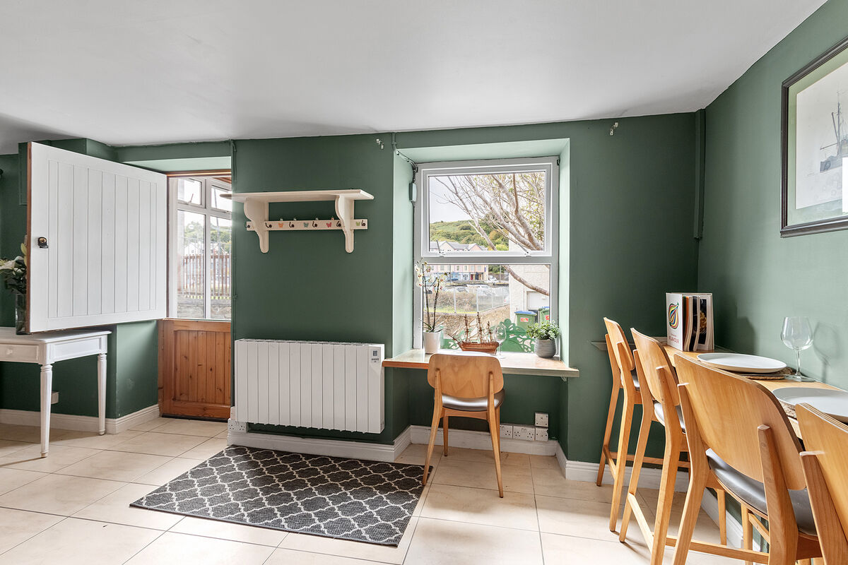 Tucked away behind a terrace of houses on Harbour Road, Harbour View Cottage is accessed by a pedestrian gate situated between the terrace and St Brendan’s primary school. Offering views of the harbour, it has a south-facing gravelled courtyard at the front and an overgrown garden with parking at the rear which Ms Hanafin says has development potential.