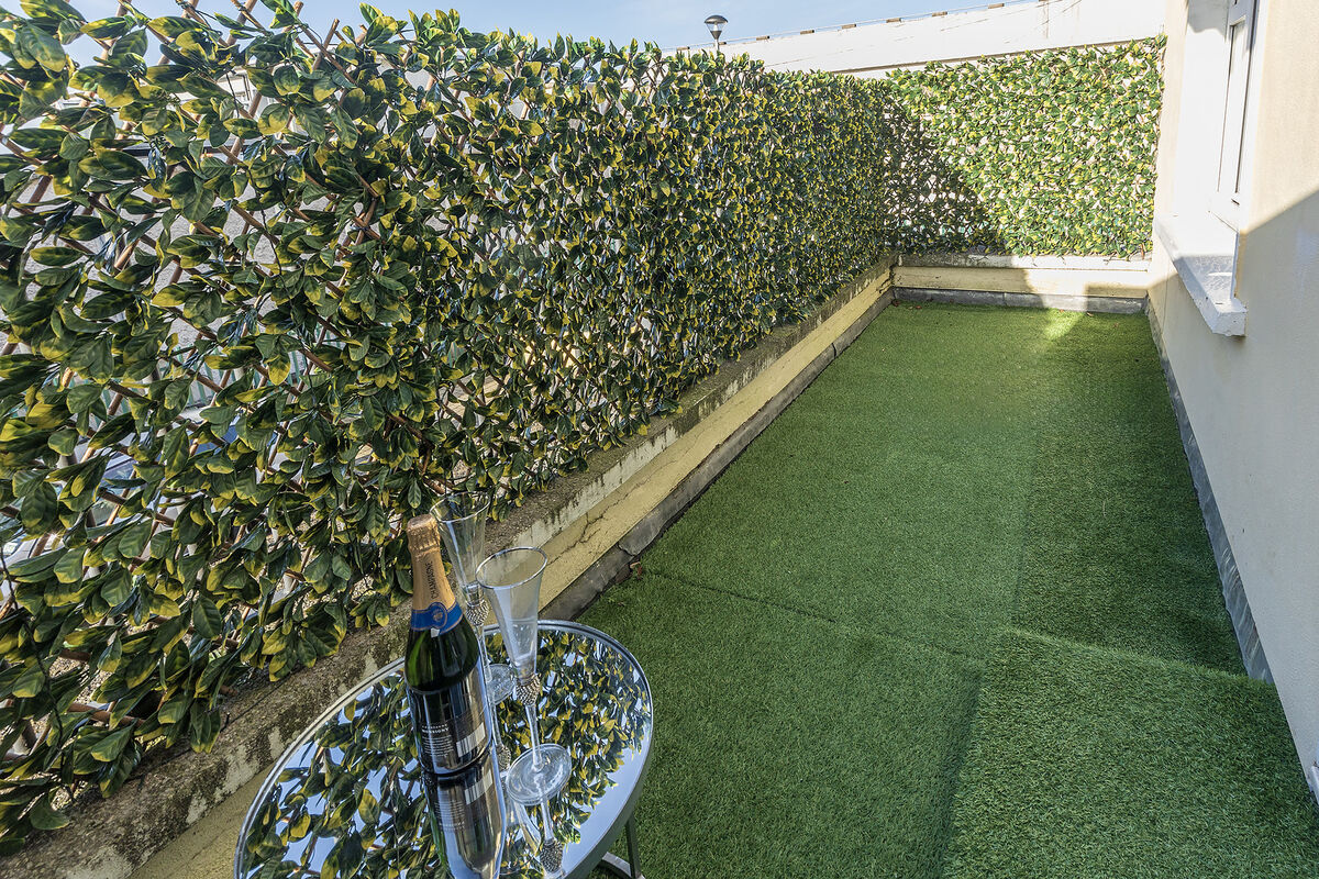 The higher up floor in the duplex has a bathroom and three bedrooms including two doubles and a single. The largest one has an en suite and sliding wardrobes.