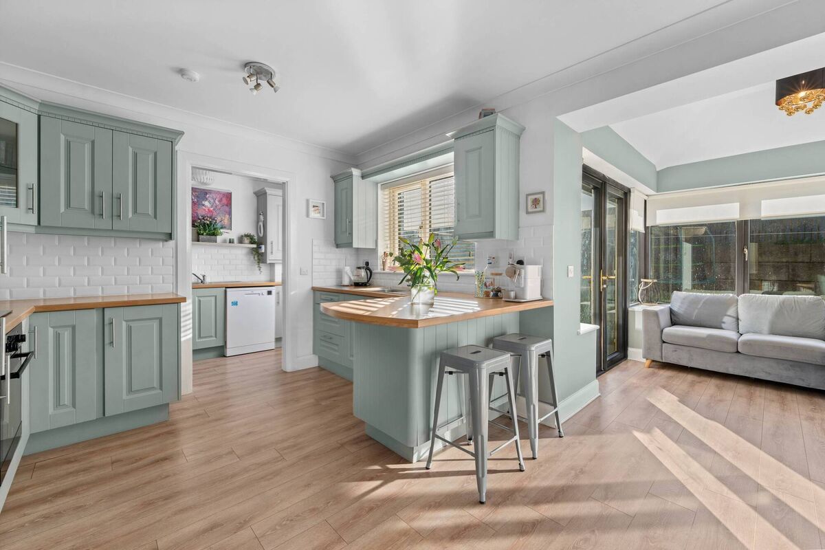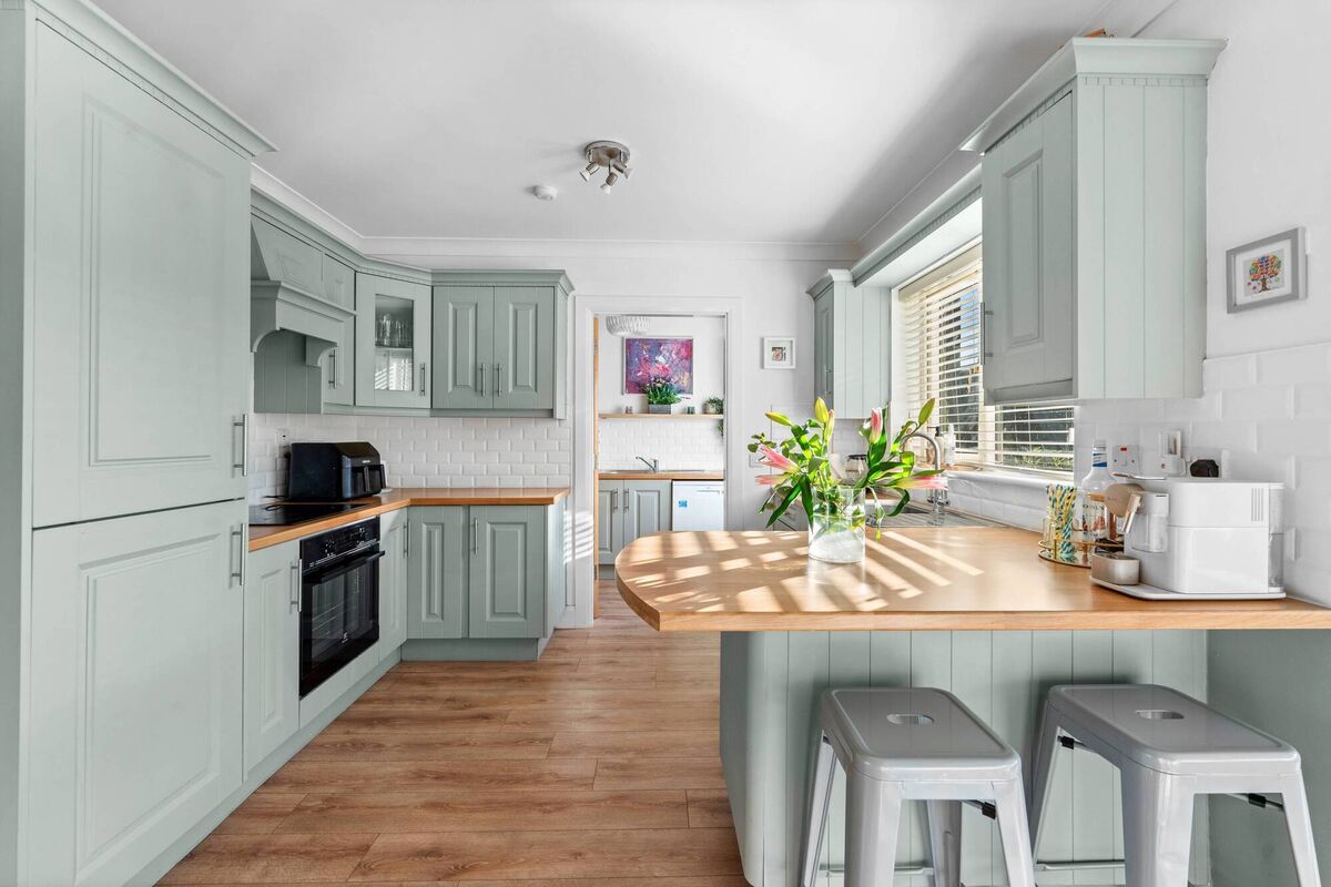 At No 56 Dealg Bán, a higher ceiling in the sunroom adds volume to the open-plan space. Natural light floods through generously glazed walls into a pale sage kitchen with white subway tiling and solid oak worktops. It’s a fresh, contemporary look.