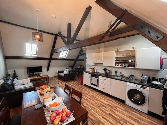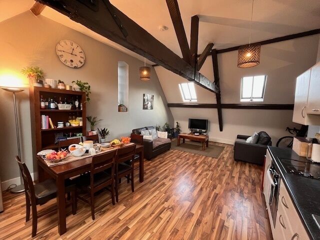Accommodation includes a kitchen/dining/living room with a high ceiling with exposed beams, timber flooring and fitted units. It also has a bathroom with exposed brickwork, two bedrooms ( one en suite) and has one designated parking space.