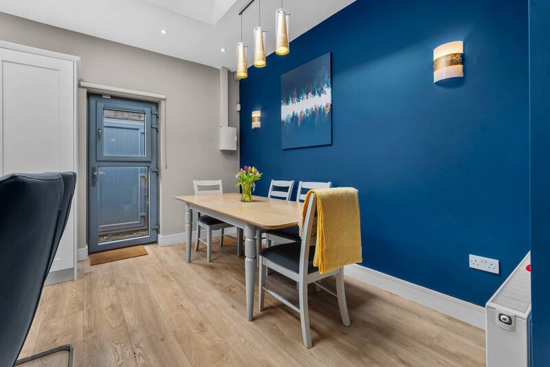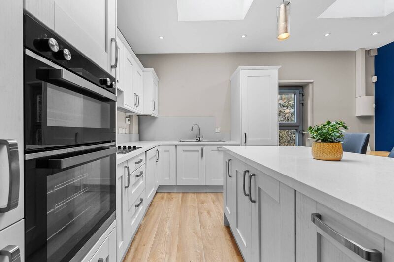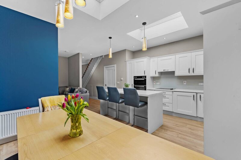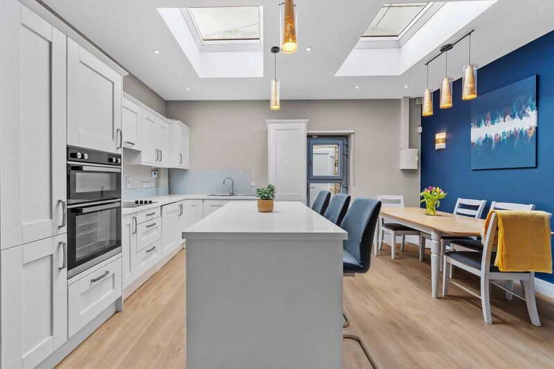 It’s a terrific open-plan space, flooded with natural light thanks to the addition of two large skylights and a fully-glazed back door, which opens on to a narrow slice of yard, just wide enough for wheelie bin storage.