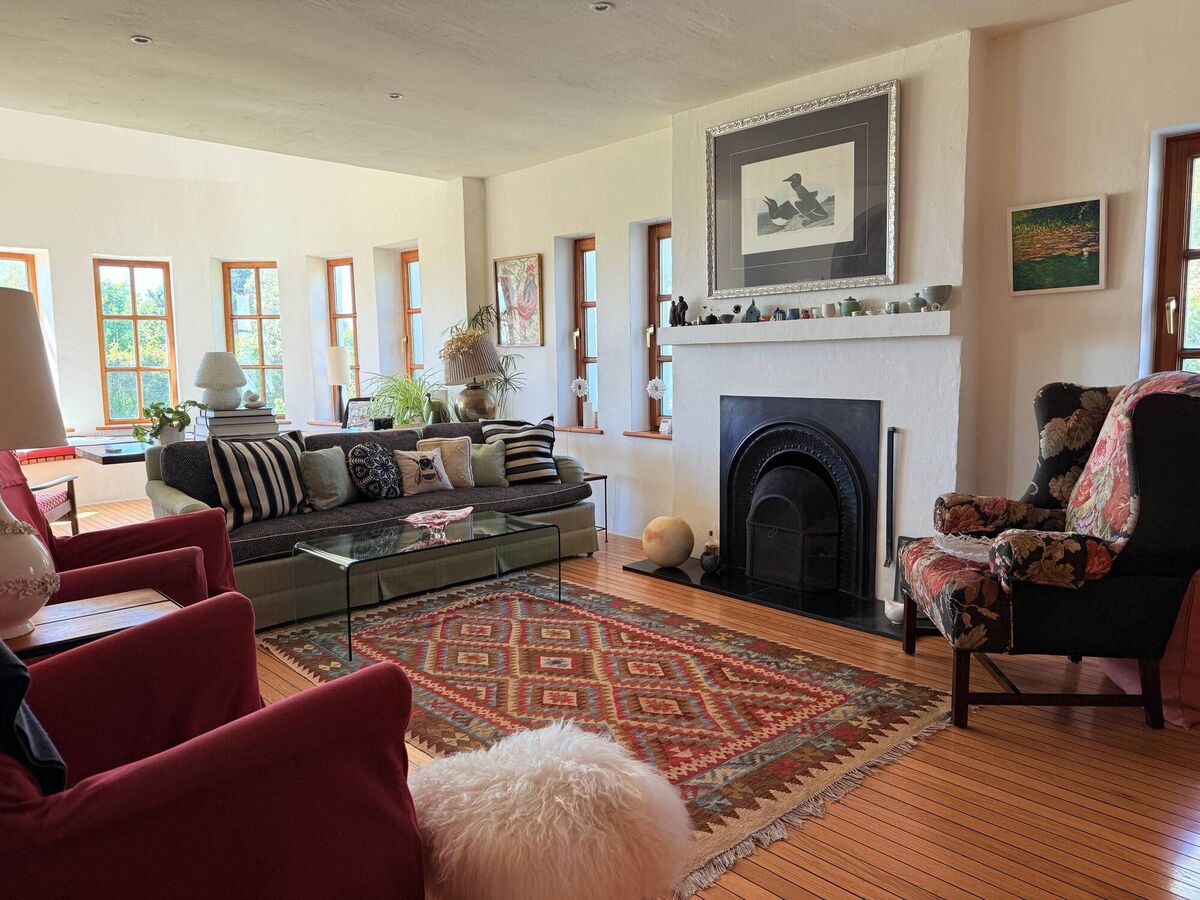 The couple’s earlier years — time spending living and cruising around Norway on yachts — is recalled in the style of flooring in the main living/sun room section: it’s done in narrow plank pale American oak, with dark caulking in between, very much luxury boat deck in look and feel, and in what it evokes for them. Workmanship, and joinery skills throughout here, are exemplary in this 25-year-old build, done by Eckhardts’ Home & Design Ltd construction company, in a hybrid mix of timber frame and solid masonry, depending on load bearing needs.