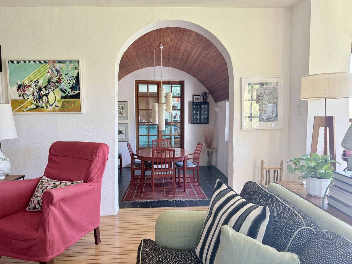 “We use the dining room every day,” Julia says when asked about her family’s home’s favoured ‘red dot’ spot, pointing to one seat at the table with its choice of views via either or both of tall, slender multi-paned windows: she explains architect Dietrich Eckhardt’s own philosophy that windows should frame views, not just be a vast expanse of glass opening up unfiltered vistas.