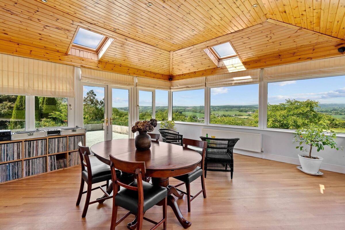 The same views — spanning four counties — are served up to the sunroom, which opens onto the terrace, as does the first floor living room.