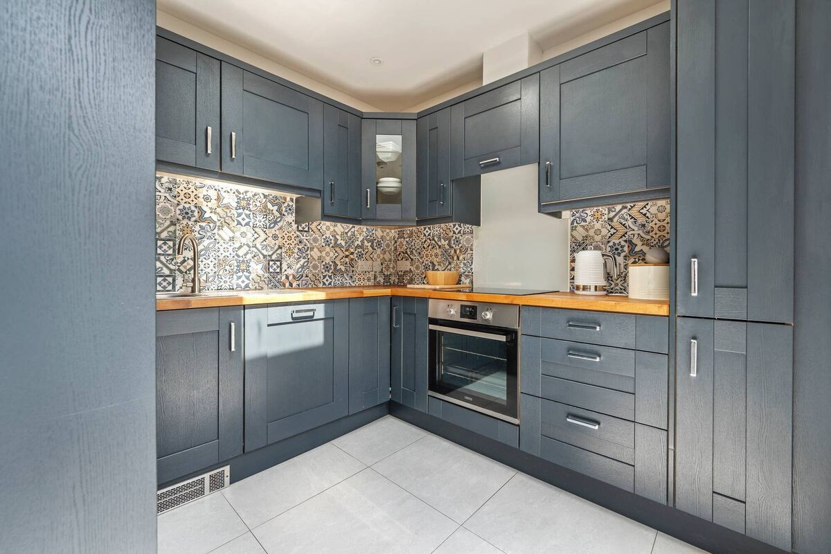 The arch leads to a rear hallway which brings you past a strikingly tiled bathroom to the neat kitchen, with Spanish-style tiling.