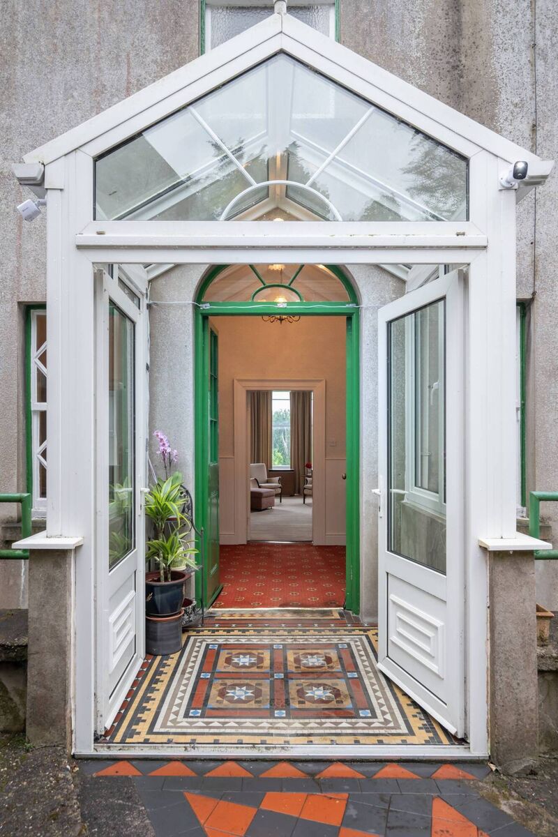 Once past the plain portal of the door onto the street, Mount Vernon is entered via a small glazed porch with encaustic-tiled floor, over a lower level rear service yard with old stores tucked into the hillside, very much a Sunday’s Well riverside residence feature.
