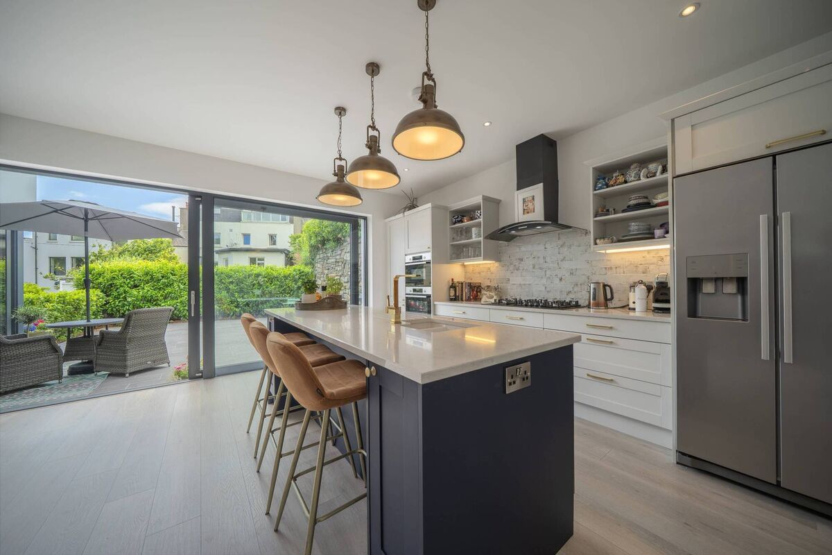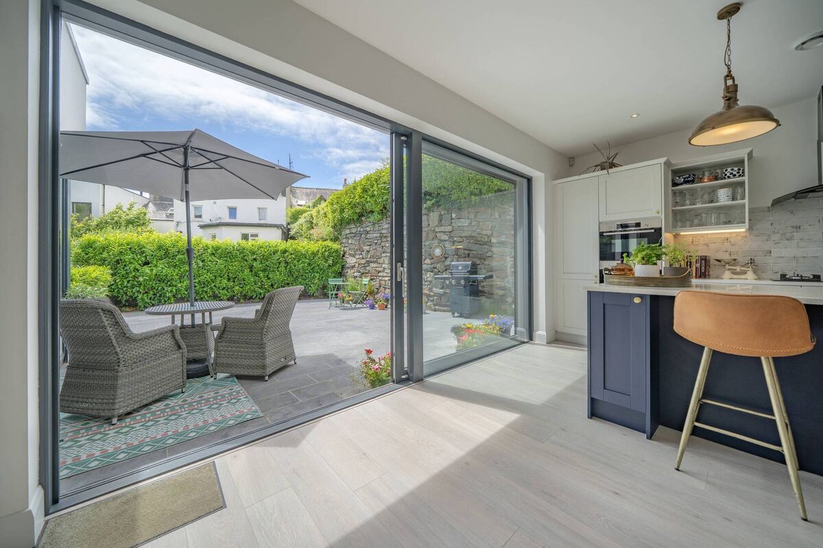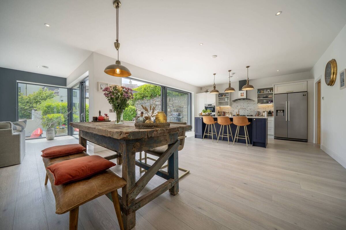 The mixed-use room is set up for casual living and entertaining, with two sets of sliding doors to a Kilkenny limestone paved patio: the extensive glazing here contrasts with the head-height, letterbox-style window on facing walls to the lane side. The kitchen with quartz-topped island/breakfast bar has units in blue and off-white, with gas hob, distressed-style splashback tiling, American-style fridge freezer, and wine chiller, with a decent-sized utility/laundry room off it.