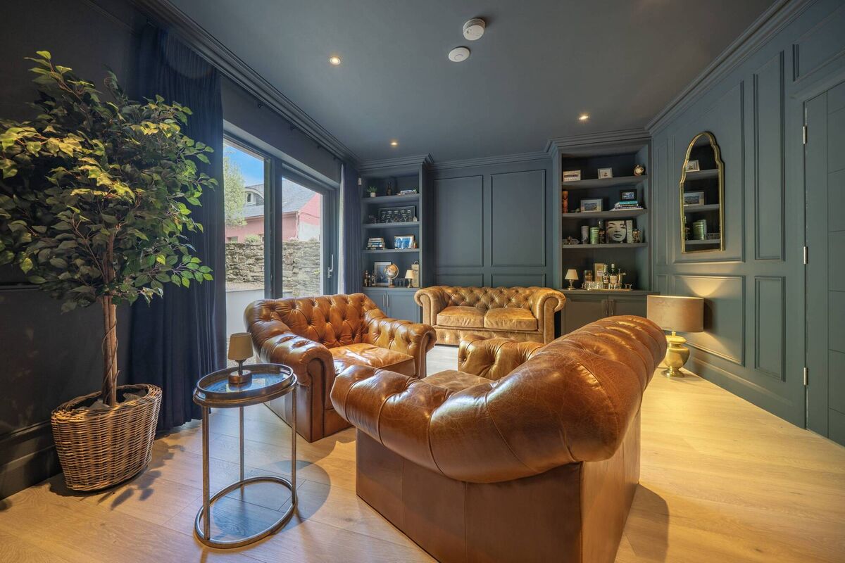 That’s all in contrast with the den/study, with walls and panelling in navy for an evening retreat/gentleman’s club vibe, with wall-mounted, flame-effect fire under a television screen, and with gable-wall sliding-door access to a small patio.