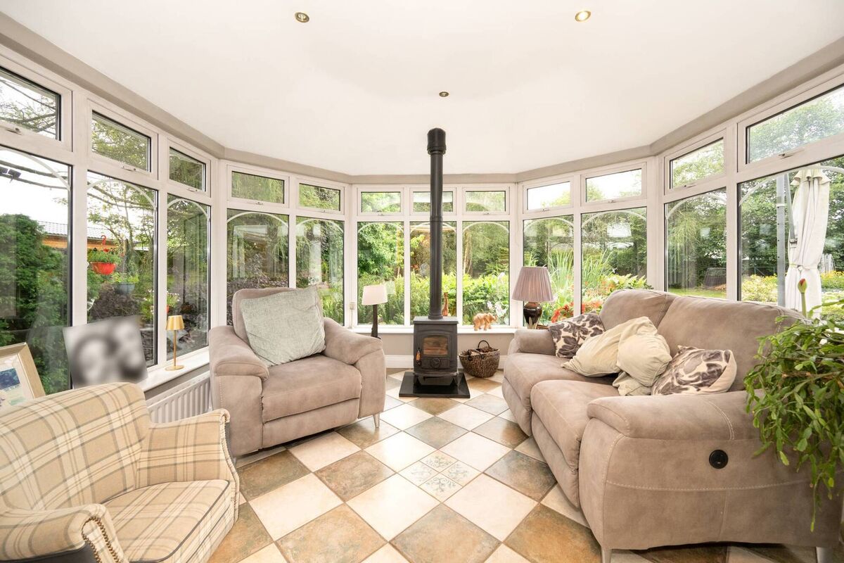 It comes with reception rooms left and right of the hall, with the larger on the left, double aspect, leading on to a dining room to the back which, in turn, leads to a sun room with solid roof and centrally set wood-burning stove at the far end.