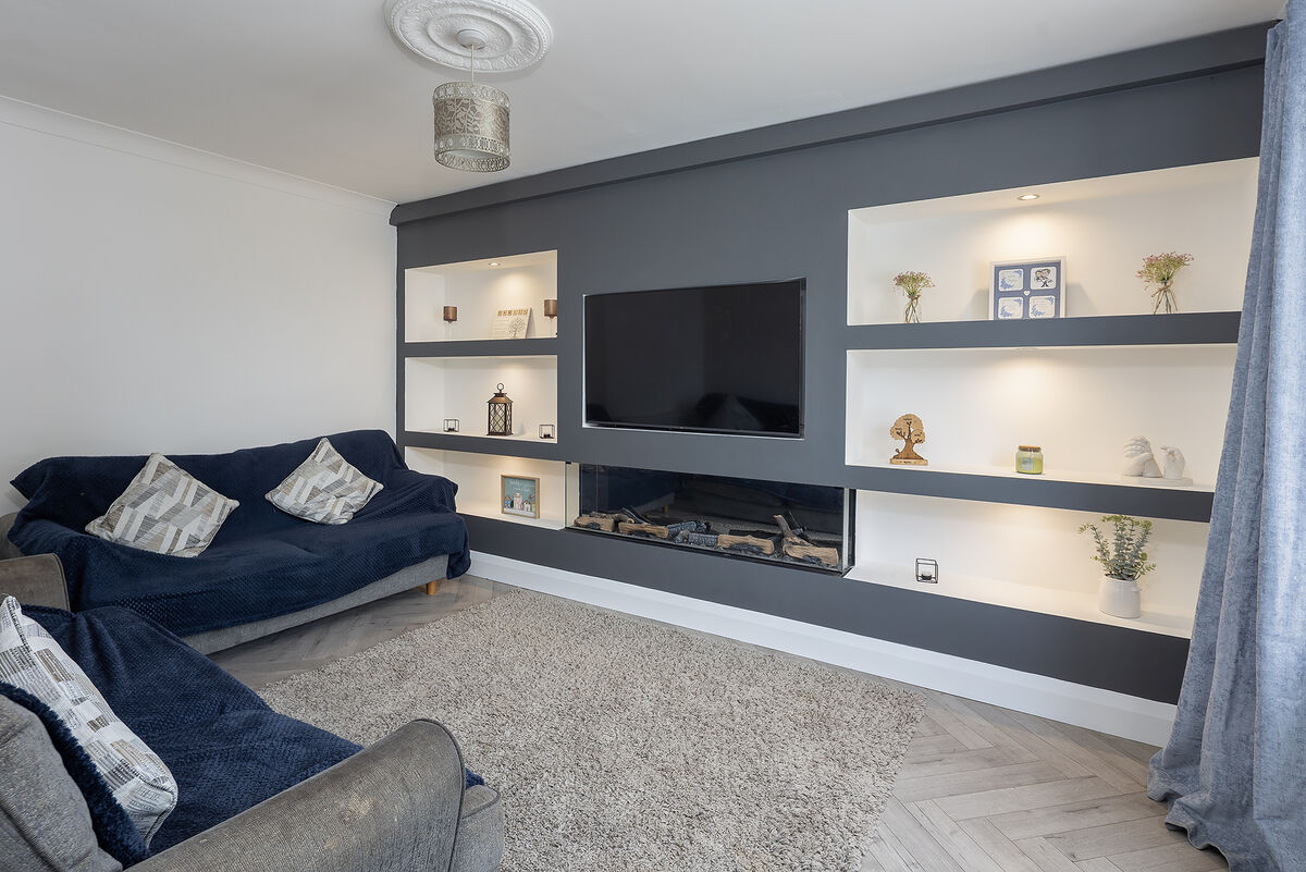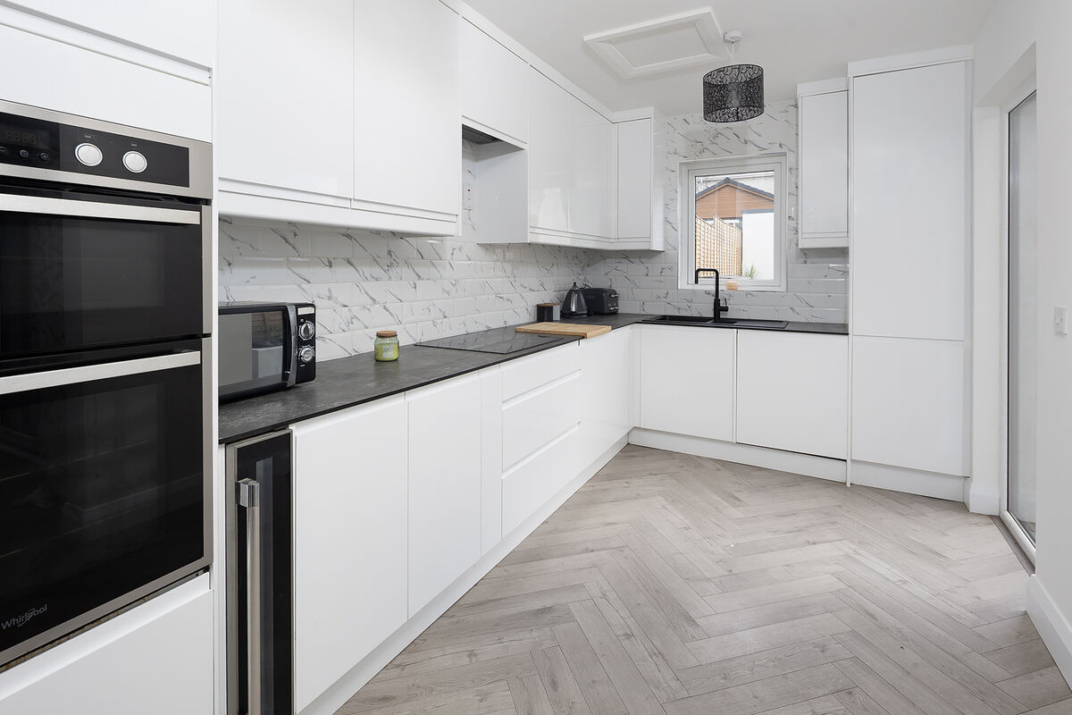 At the front is a living room with herringbone flooring and a modern media wall with a contemporary electric fire and, at the rear, a kitchen/diner with white gloss handleless units with integrated appliances and a wine fridge.