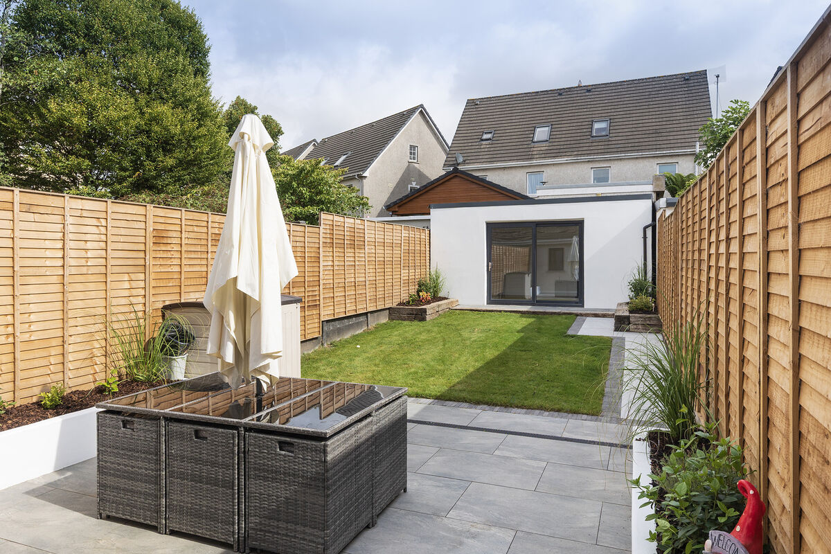 The property has parking at front and a garden with a patio , lawn and a recently added floored outbuilding with sliding patio doors.